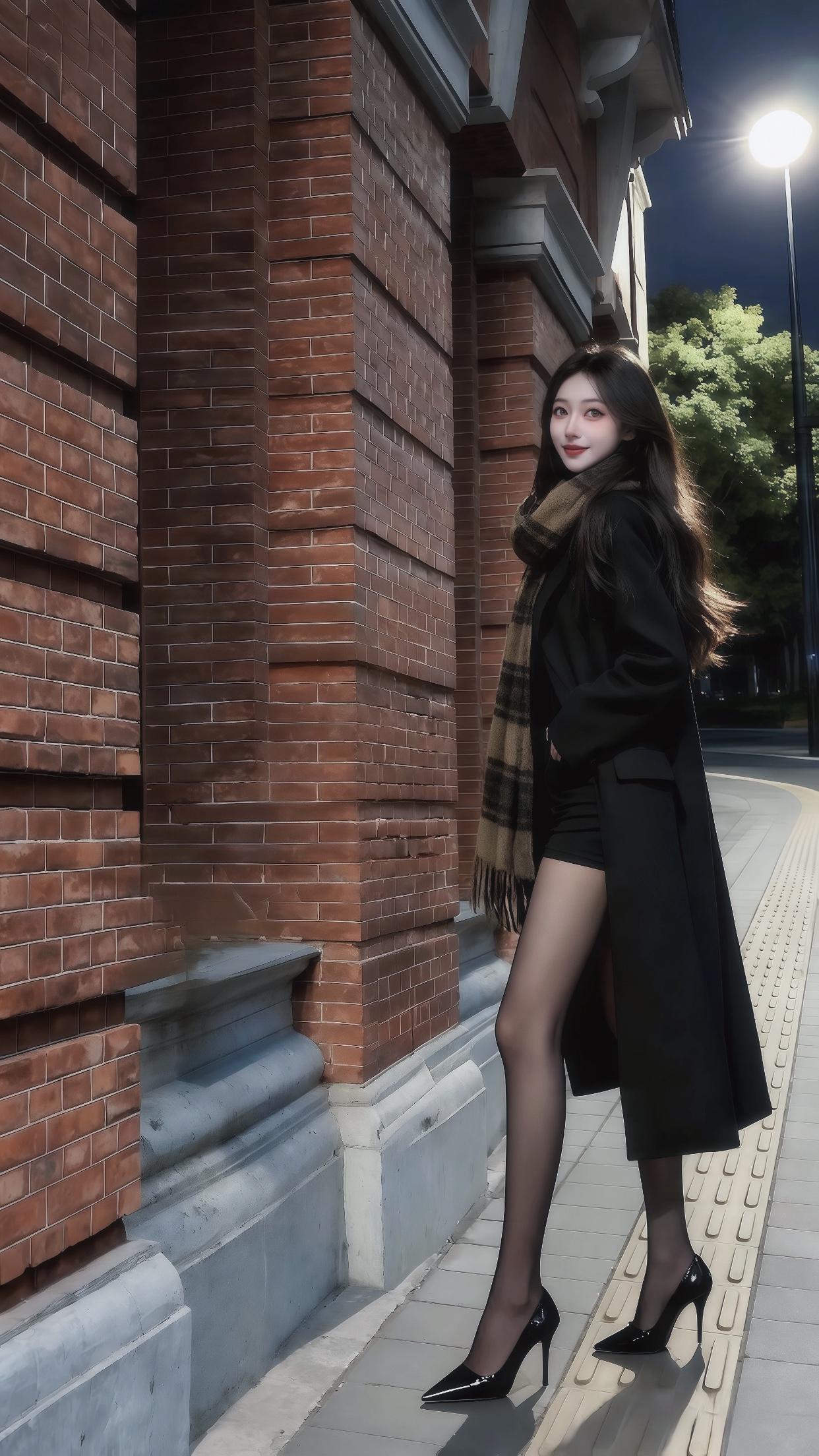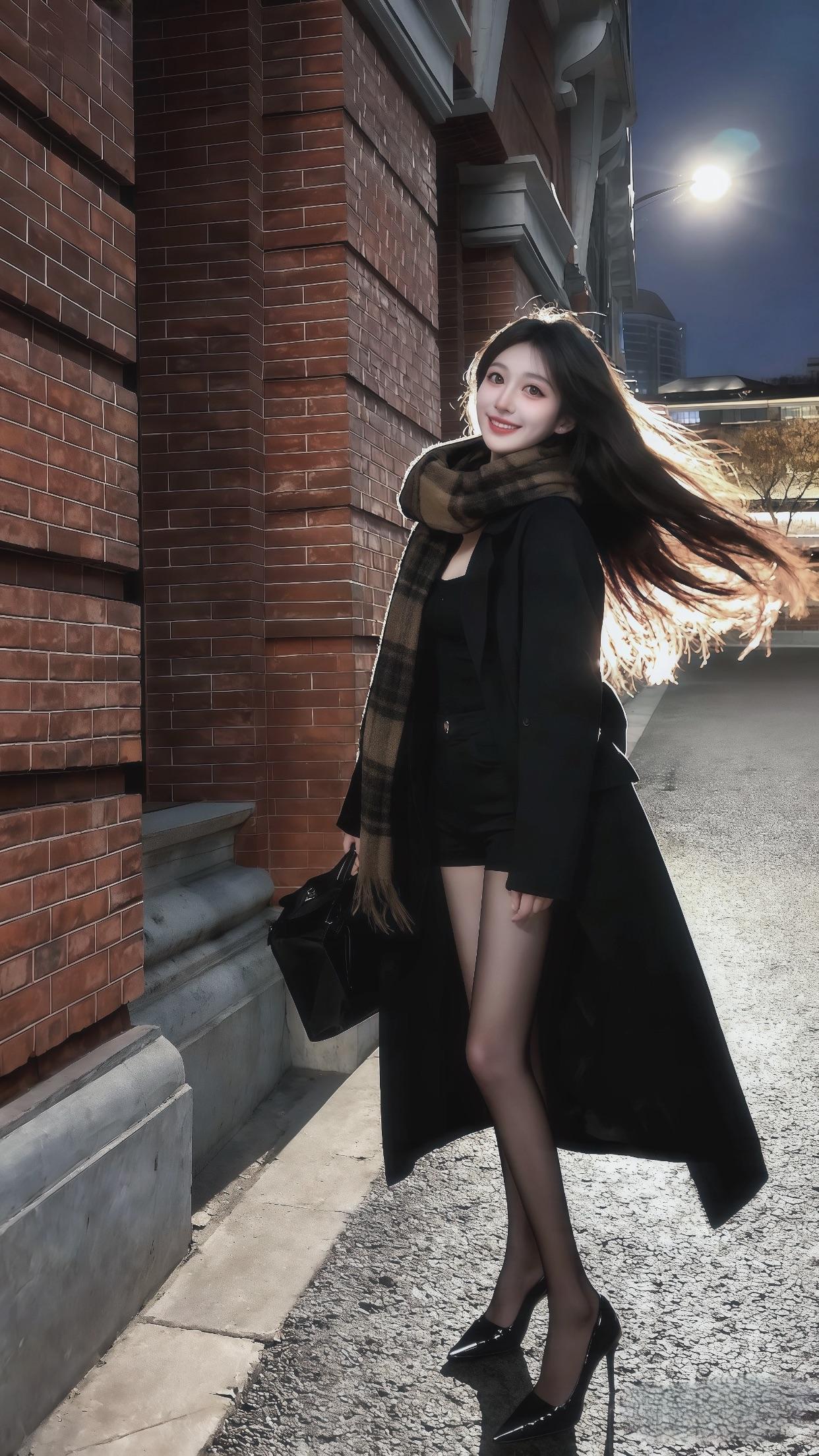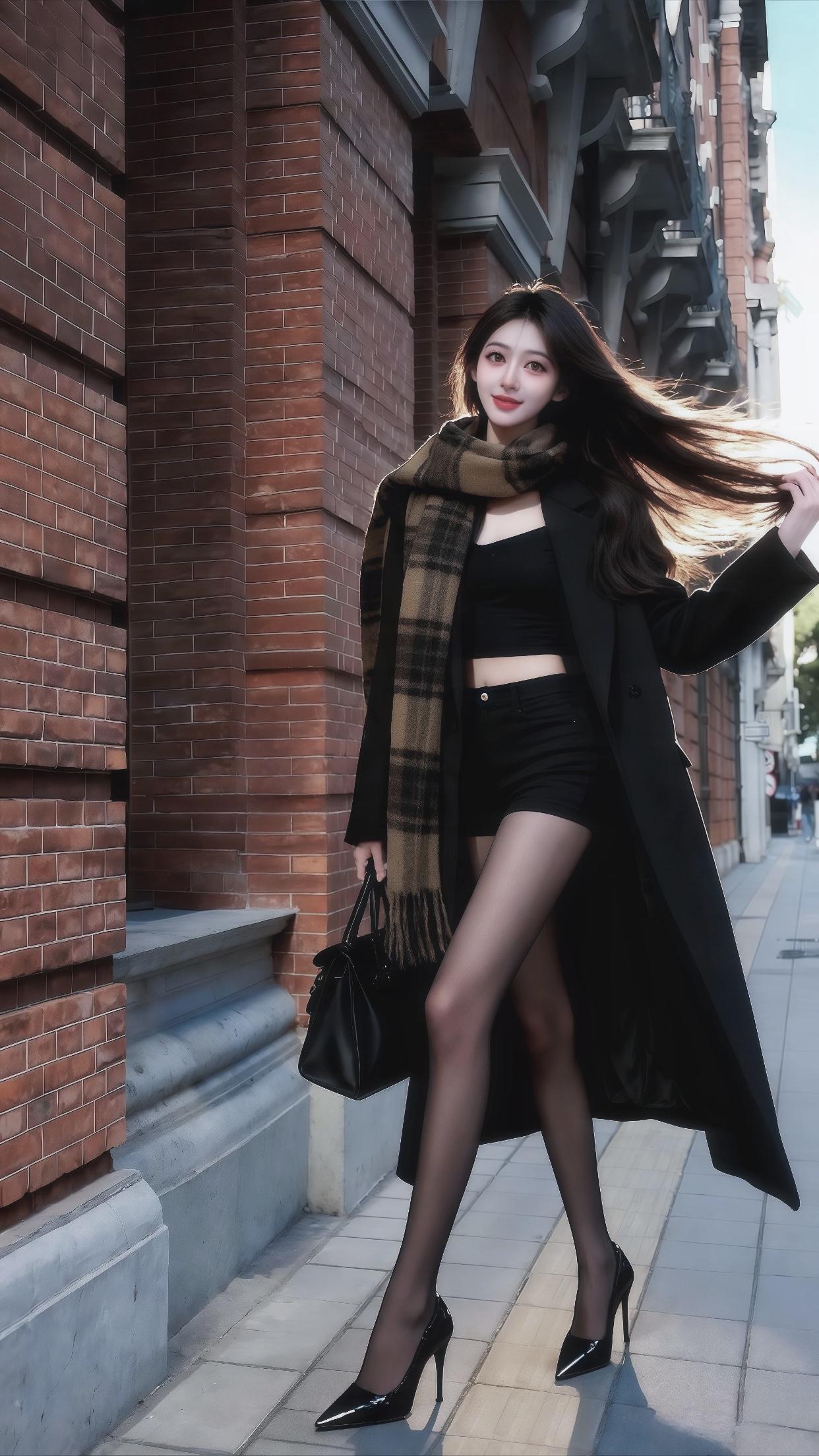 优雅自信穿搭分享都市时尚女郎,黑衣黑裙,优雅行走在红砖街头。