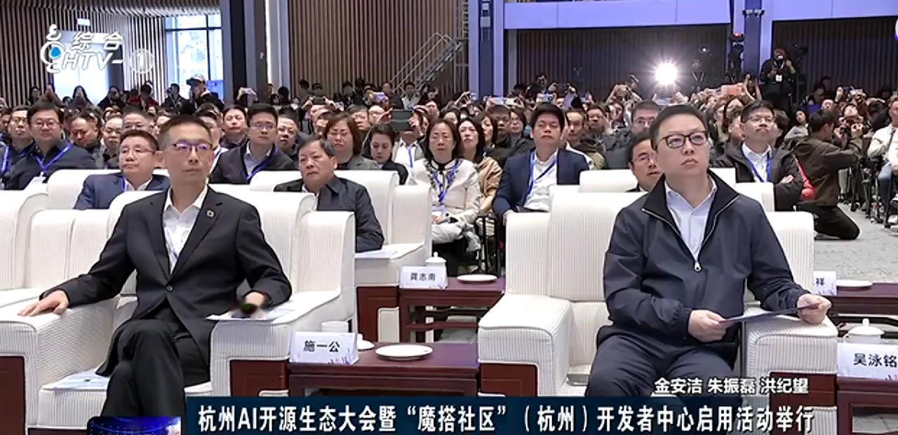 11月22日,杭州AI开源生态大会暨“魔搭社区”(杭州)开发者中心启用活动举行。视频画面看到了阿里合伙人、阿里巴巴集团执行副总裁邵晓锋、西湖大学校长施一公、阿里巴巴CEO吴泳铭等。