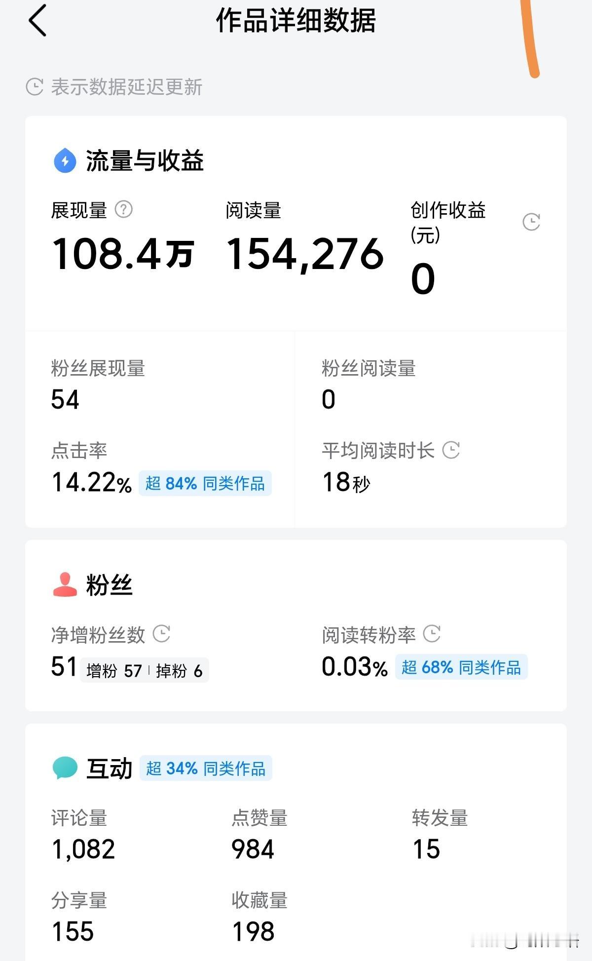 有点激动了!大家都左手写头条,右手晒收益,我也来分享我的喜悦! 就前几天,我随手写了一篇百字小短文,配了张图,真没指望能有多大反响。结果你们猜怎么着?刚才我刷新后台一看,好家伙,展现量108万,阅读量15万多!我第一反应就是揉了揉眼睛,生怕是自己看花了。 现在静下心想想,这篇内容其实就来自一段童年记忆的随感。当时心里突然有些触动,就顺手记录下来,特别简单。可能正是因为没想太多,没刻意追求什么爆款套路,纯粹是真实感受的分享,反而打动了不少人。 我还发现一个特别重要的点——互动。每一个给我点赞、评论的朋友,我都会认真回复。这个小小的举动真的很关键,你回复了,大家就觉得被看见了,更愿意留下来交流。评论区一下子就热闹起来,好多朋友还分享了自己的故事和见解,说得特别好,连我都跟着涨了不少知识! 所以啊朋友们,做内容真的不用想得太复杂。有时候你越是不给自己设限,不去刻意追求惊世骇俗的效果,轻松一点,真诚地分享真实的想法和感受,反而更容易引发共鸣。 这次经历真是给我注入了满满的动力!也希望能给正在努力创作的你加把劲——别担心,放心去写,真诚地去表达,说不定下一个迎来惊喜的就是你!