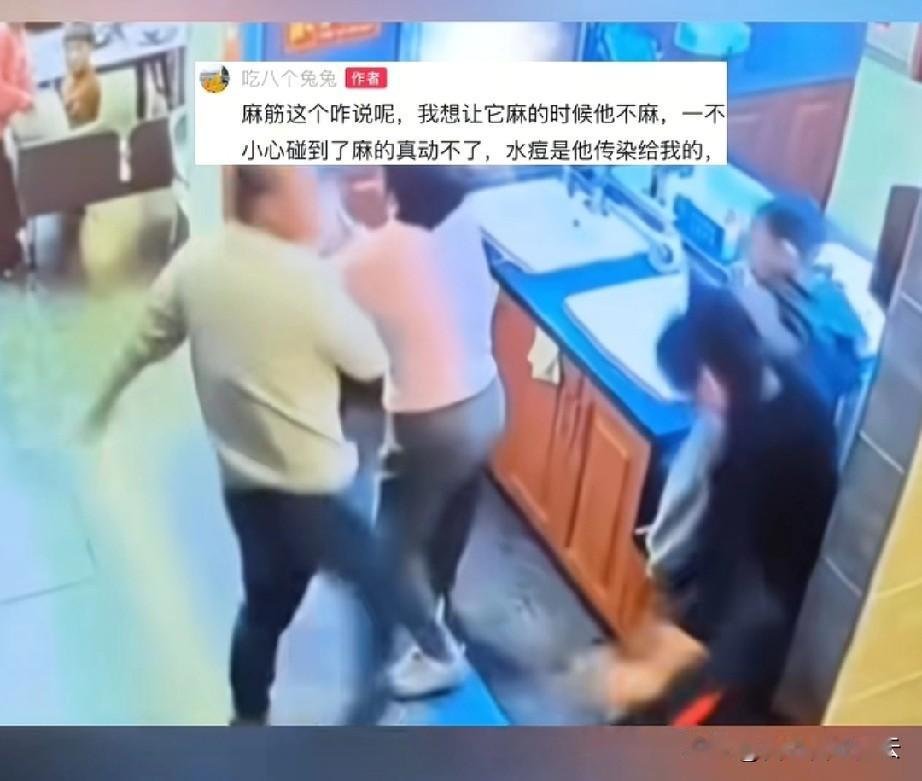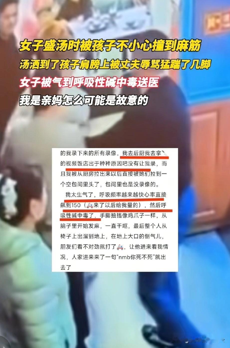 女子抱着孩子盛汤,孩子从后面触碰了她一下。正好碰到她的麻筋上,女子手一抖,把汤撒到了自己腿部和孩子的左肩处。孩子只有四岁,因为轻微的烫伤和惊吓开始大哭。其实女子穿的薄,烫伤的更严重。 她刚要安抚孩子,突然被丈夫从背后一脚踹到屁股,女子愣了,这是在餐厅,大庭广众之下,明明她也受伤了,丈夫真是一点面子不给。她解释自己不是故意的,丈夫也不听,反而对她殴打的更厉害。 朋友是个女的,一直在阻拦。却被女子丈夫一次次推开,餐厅的其他人听到动静,都过来阻拦男子,男子还来劲了,这么多人他都不放过妻子。 后来女子实在气不过,从厨房拿了一把刀,被周围人劝下把她送到一个空包间里。女子越想越气,她是孩子的亲妈,怎么想让孩子受伤呢?明明她自己也受伤了,丈夫不但不关心还在大庭广众之下打她,打老婆难道就能显示出他自己多有能耐吗? 后面女子气的呼吸性碱中毒,手脚抽搐的像鸡爪,脑子发麻,一直干呕,情况很危急。朋友打了120,让她丈夫去看看她,丈夫来了后咒骂了她一句后就出去了。 整段视频看的真窒息,孩子是女人在管,丈夫当甩手掌柜。可孩子哭了,他开始关心孩子了,把所有责任都甩到妻子身上,还动手打妻子。这样的男人看着让人来气,太没责任心、没担当。 有网友说了,男子可能还觉得自己很能耐呢,在外面受气,拿妻子出气呢! 对于这件事,你怎么看呢?