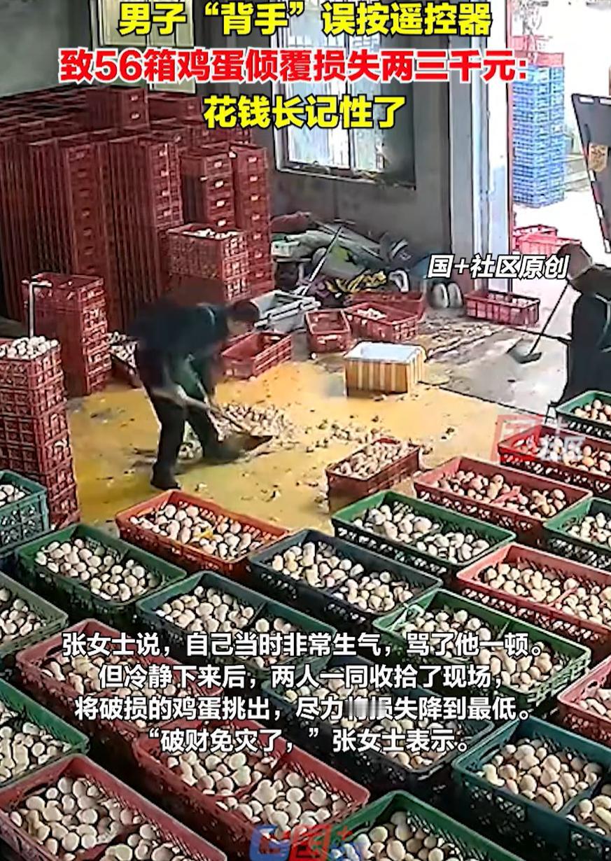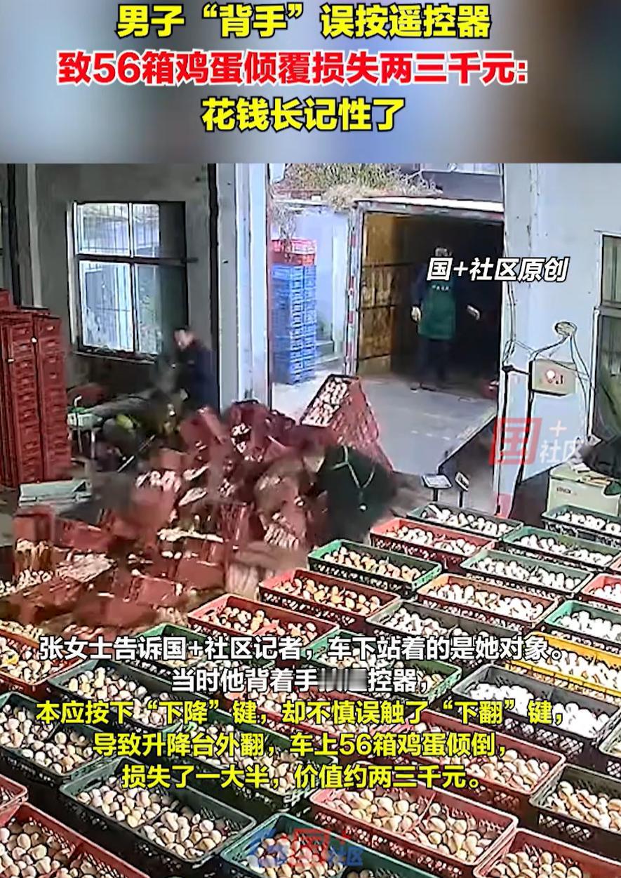 事教人一次就会!山东济南,两名男子在仓库卸鸡蛋,本来是个再普通不过的活。一个人背着手按升降台遥控器,看样子技术挺熟,心态也挺稳,谁都不会想到一个小动作就能折腾出两千多块钱的教训 监控显示,男子当时背着手,拿着升降台的遥控器,想都没想就按了下去。本来要按下降键,结果手指一滑,碰上了旁边那个下翻键。就这一下,整整齐齐堆着的56箱鸡蛋,哗啦一声全倒在地上,蛋壳碎裂,蛋液横流 他对象张女士后来聊起这事,也是相当无奈,说损失差不多两三千块钱。但她也说,人倒是想开了,觉得这钱花得值,就当买个教训,以后再也不背着手瞎按遥控器了 有网友说:损失不大,长记性避免了下次更大的事故,划算 其实细想想还真是这样,有些东西摔一次能记一辈子,现实里很多道理都不是嘴上说说,是用钱砸出来的,现在他肯定明白了,做事还得一步一步来,不能太随意 很多人工作久了,难免会生出一种我闭着眼都能干的感觉。按遥控器背着手,拎东西不看脚下,电话随手一滑,都是这种心理。平时没事,一旦出点意外,就会发现所谓的熟练,其实只是侥幸