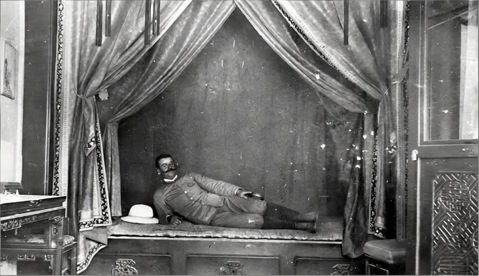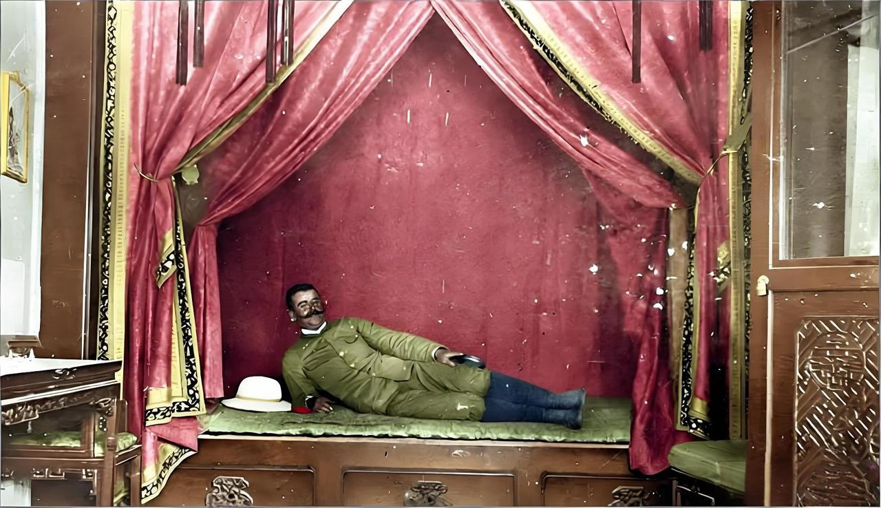 八国联军侵华时期,一名八国联军军官四仰八叉地躺在光绪皇帝的御床上,脸上满是得意与傲慢。他身着军装,姿态肆意,仿佛在炫耀对中国皇权象征的践踏。 床幔华丽精致,中式家具尽显皇家规制,却成了侵略者彰显“胜利”的舞台。他特意召来摄影师记录这一幕, 以躺在中国天子御榻的姿态,炫耀列强对中国主权的野蛮践踏。