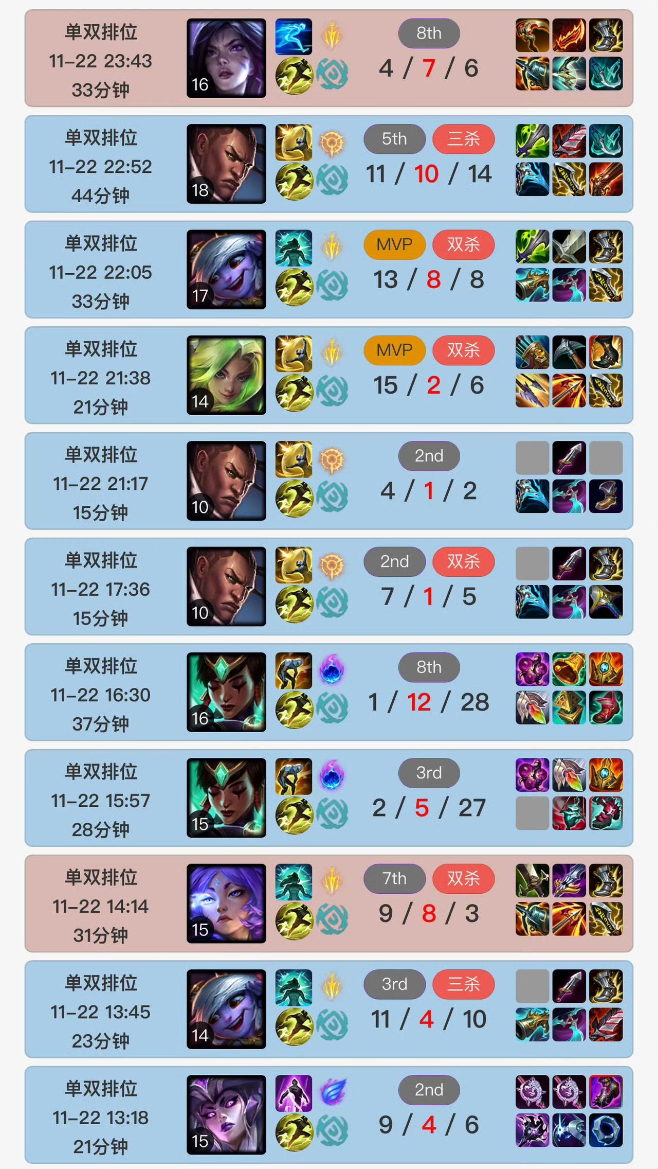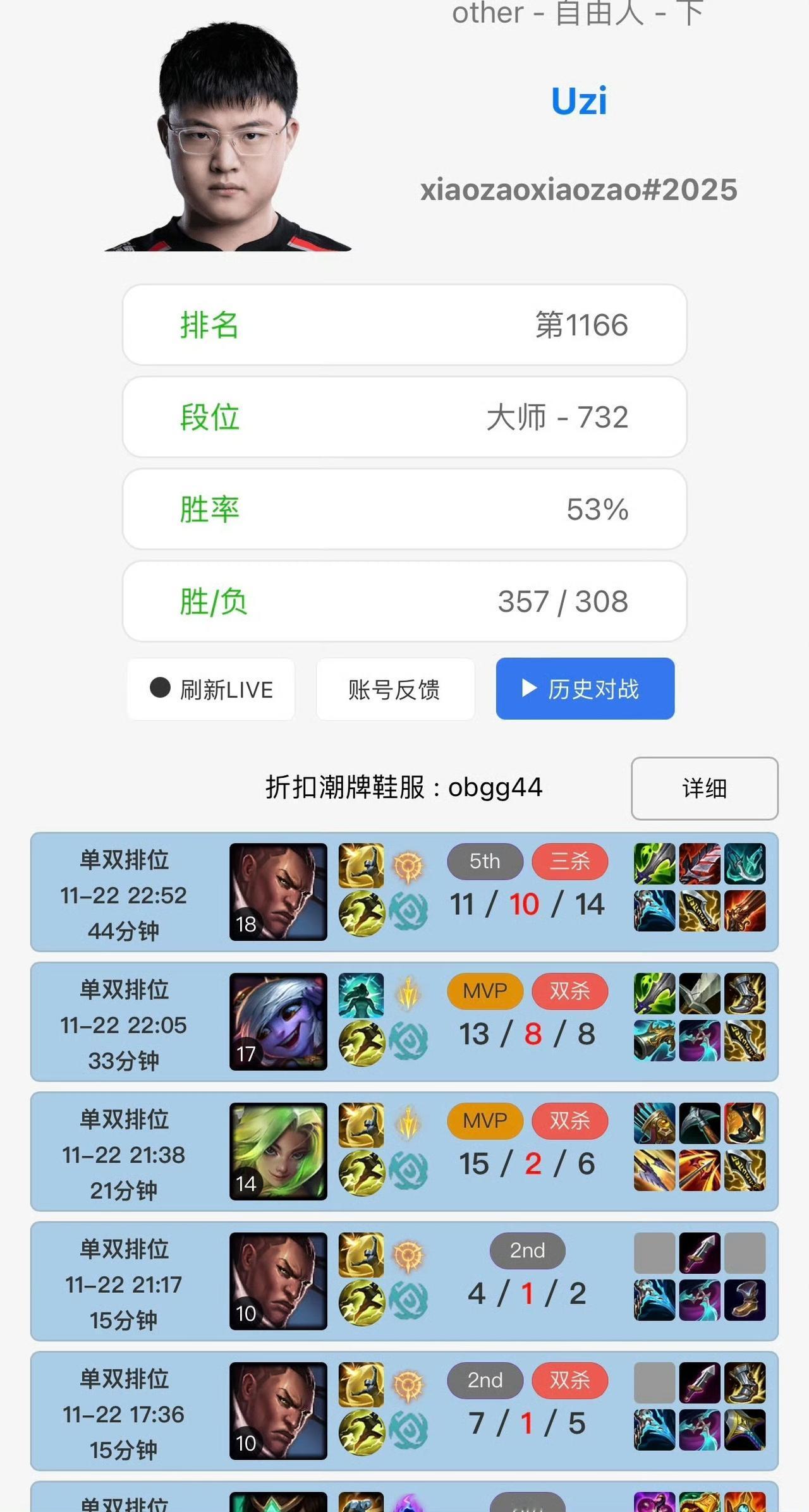 Uzi近期在韩服保持着超高强度的排位节奏,状态十分亮眼,相关战绩也引发了大量复出猜测。 11月22日他狂打17把韩服排位,成功冲上韩服700分;前一日排位时还偶遇厂长,两人先同队作战,后续开启双排,厂长的螳螂更是成功Carry全场。 11月15日凌晨,他用卡莎打出28/3/7的统治级战绩对位Ruler;此前还有过通宵连打15局排位的经历,期间招牌卡莎不仅拿过28杀,还斩获两次四杀和一次五杀。另外在一波10连胜中,他用了7个不同英雄且拿下5局MVP,一路打到钻石1 42点。 近期他日均排位量达15 - 20场,曾从凌晨5点打到次日凌晨5点半,仅中途下线吃了顿饭;还出现过9把排位仅输2把的高效上分时段,不过也有过打出16/6的卢锡安等出色数据却遭遇6连败的情况。UZI UZi uzi超绝跳枪