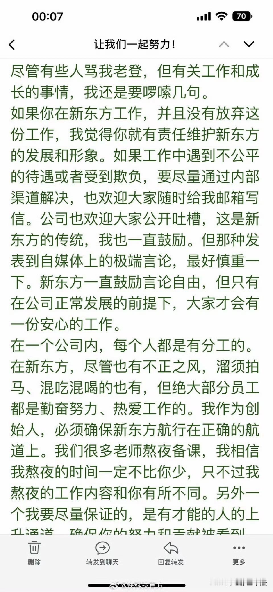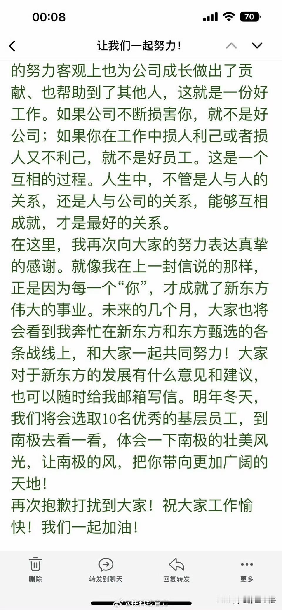 看完俞敏洪向员工再次道歉的长文,只能说俞敏洪确实是个企业家,不信你看如下要点: 第一,他诚恳的解释自己去南极旅游不是在炫耀,同时他认为一个愿意分享的老板比一个神秘的老板更能让员工放心; 第二,发信用红色字体没有特别含义,有些员工因此不开心了,他愿意道歉; 第三,去南极是受邀,主演目的不止是旅游,也是为了工作; 第四,老板与员工分工不同,但只要你还不放弃新东方的工作,你就有责任维护新东方的形象,鼓励公开发言,但是极端言论要慎重; 第五,他承认自己工作主观,但是他还认为客观上老板和员工必须得共赢; 怎么说呢,态度很诚恳,但没有一味的向员工低头,有理有据,没放弃自己的权利,也没放弃自己的原则,但也安抚了员工情绪,俞敏洪是条汉子,是个高手! 这事其实没法理性讨论,因为大家各自立场不同,但我想对那些不满俞敏洪去南极旅游的人说,“嫌打工赚的少,被老板压榨了,那就自己去创业!”