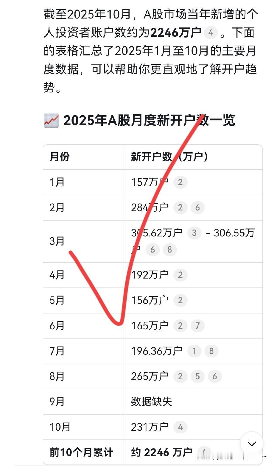 速阅!就在刚刚, deep seek了一下,截止10月份,2025年A股新开户的股民达到了2200多万,你们说这个数字还可以吧? 来!新股民们,评论区做个小调查,盈利的扣1,亏损的扣2,当然老股民也可以参与!动动你的小手,打开你的账户,看看到底是赢了还是亏了。 别小看了这个调查,因为他很重要,可以关系到A股未来的生态,也可以给上面或者是你做个参考。 当然,投资有赢就有亏,大家进入股市肯定是想赚钱的。如果绝大部分能赚到钱,那是最好不过的了。如果绝大多数人赚不到钱,所以未来如何投资,投多少也要谨慎而行吧。[玫瑰]