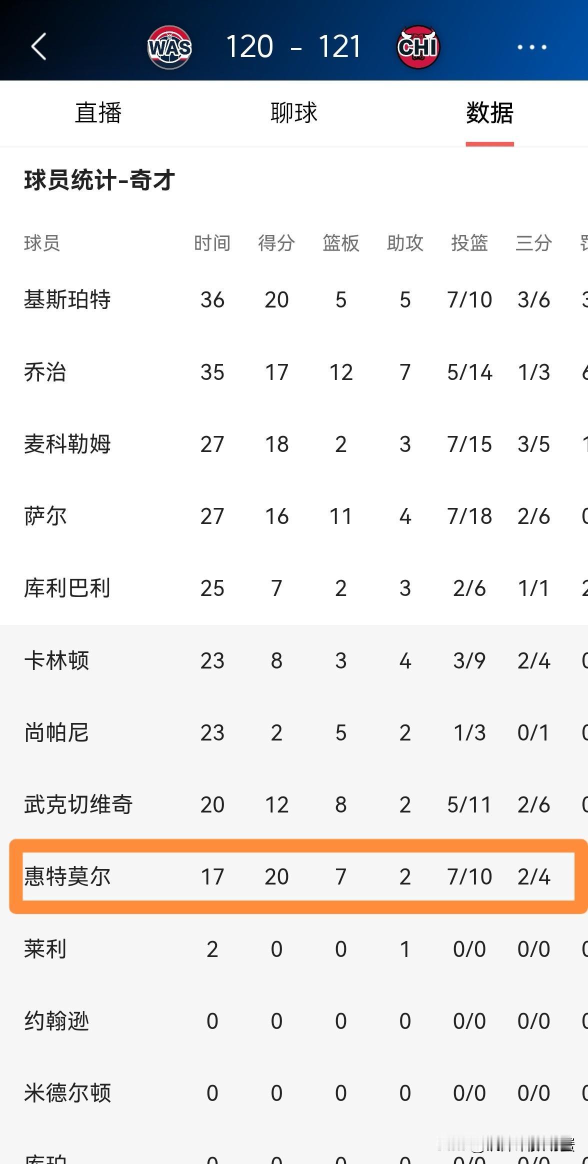 奇才新星惠特摩尔真是虽败犹荣!虽然今天奇才在客场以120:121惜败于公牛,但是惠特摩尔却打出了本赛季开赛以来的最佳表现。 全场比赛下来,惠特摩尔替补出战17分钟,投篮10中7,其中三分球4中2、罚球5中4非常高效的砍下20分7篮板2助攻,他的场上正负值为+4。 毫不夸张的说,如果本场比赛惠特摩尔的出场时间能够超过20分钟,奇才完全有希望赢下比赛。