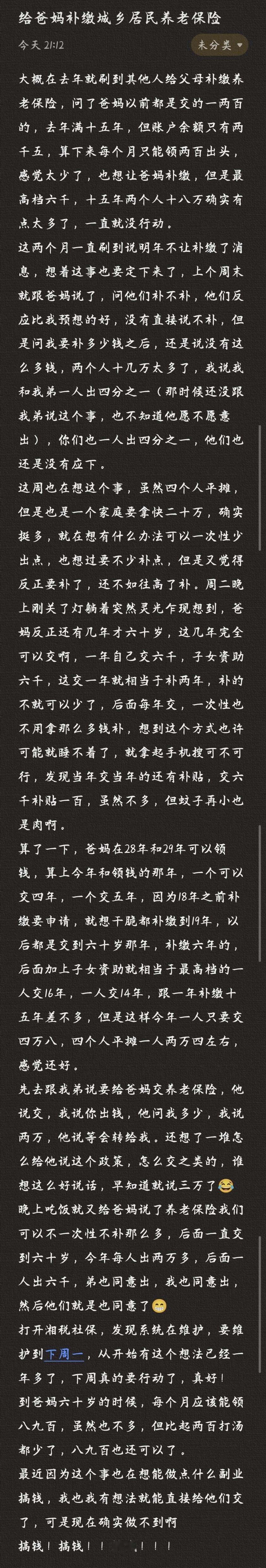 给爸妈补缴城乡居民养老保险 大概在去年就刷到其他人给父母补缴养老保险,问了爸妈以前都是交的一两百的,去年满十五年,但账户余额只有两千五,算下来每个月只能领两百出头,感觉太少了,也想让爸妈补缴,但是最高档六千,十五年两个人十八万确实有点太多了,一直就没行动。这两个月一直刷到说明年不让补缴了消息,想着这事也要定下来了,上个周末就跟爸妈说了,问他们补不补,他们反应比我预想的好,没有直接说不补,但是问我要补多少钱之后,还是说没有这么多钱,两个人十几万太多了,我说我和我弟一人出四分之一(那时候还没跟我弟说这个事,也不知道他愿不愿意出),你们也一人出四分之一,他们也还是没有应下。这周也在想这个事,虽然四个人平摊,但是也是一个家庭要拿快二十万,确实挺多,就在想有什么办法可以一次性少出点,也想过要不少补点,但是又觉得反正要补了,还不如往高了补。周二晚上刚关了灯躺着突然灵光乍现想到,爸妈反正还有几年才六十岁,这几年完全可以交啊,一年自己交六千,子女资助六千,这交一年就相当于补两年,补的不就可以少了,后面每年交,一次性也不用拿那么多钱补,想到这个方式也许可能就睡不着了,就拿起手机搜可不可行,发现当年交当年的还有补贴,交六千补贴一百,虽然不多,但蚊子再小也是肉啊。算了一下,爸妈在28年和29年可以领钱,算上今年和领钱的那年,一个可以交四年,一个交五年,因为18年之前补缴要申请,就想干脆都补缴到19年,以后都是交到六十岁那年,补缴六年的,后面加上子女资助就相当于最高档的一人交16年,一人交14年,跟一年补缴十五年差不多,但是这样今年一人只要交四万八,四个人平摊一人两万四左右,感觉还好。先去跟我弟说要给爸妈交养老保险,他说交,我说你出钱,他问我多少,我说两万,他说等会转给我。还想了一堆怎么给他说这个政策,怎么交之类的,谁想这么好说话,早知道就说三万了😂晚上吃饭就又给爸妈说了养老保险我们可以不一次性不补那么多,后面一直交到六十岁,今年每人出两万多,后面一人出六千,弟也同意出,我也同意出,然后他们就是也同意了😁打开湘税社保,发现系统在维护,要维护到下周一,从开始有这个想法已经一年多了,下周真的要行动了,真好!到爸妈六十岁的时候,每个月应该能领八九百,虽然也不多,但比起两百打汤都少了,八九百也还可以了。最近因为这个事也在想能做点什么副业搞钱,我也我有想法就能直接给他们交了,可是现在确实做不到啊搞钱!