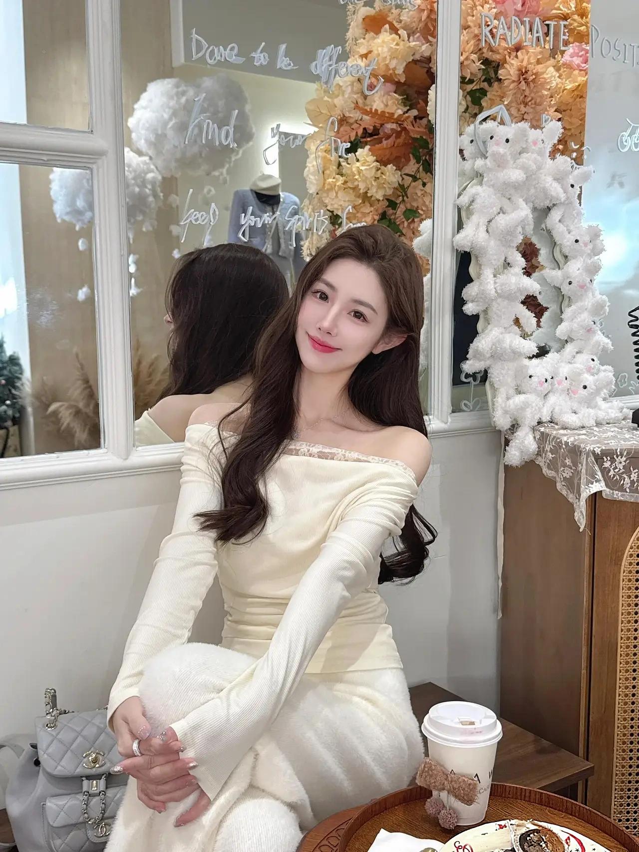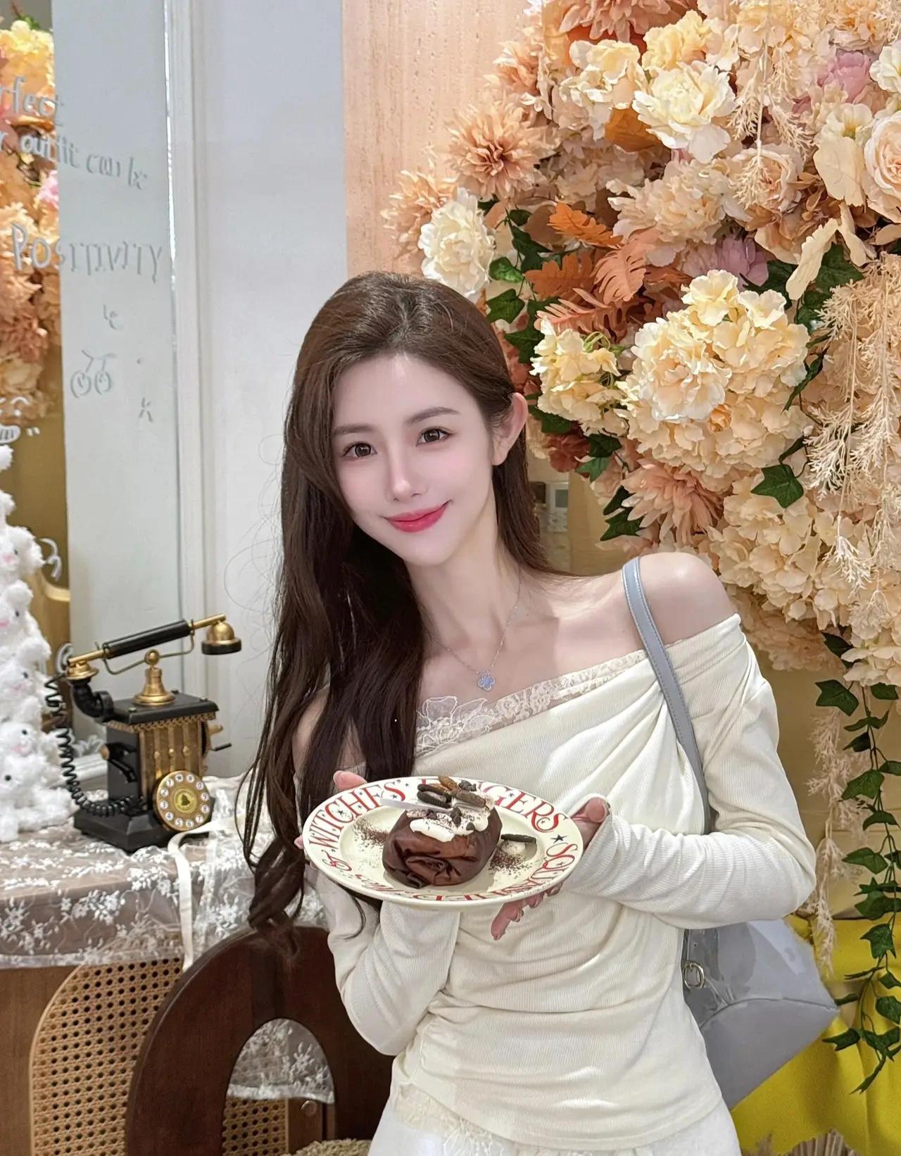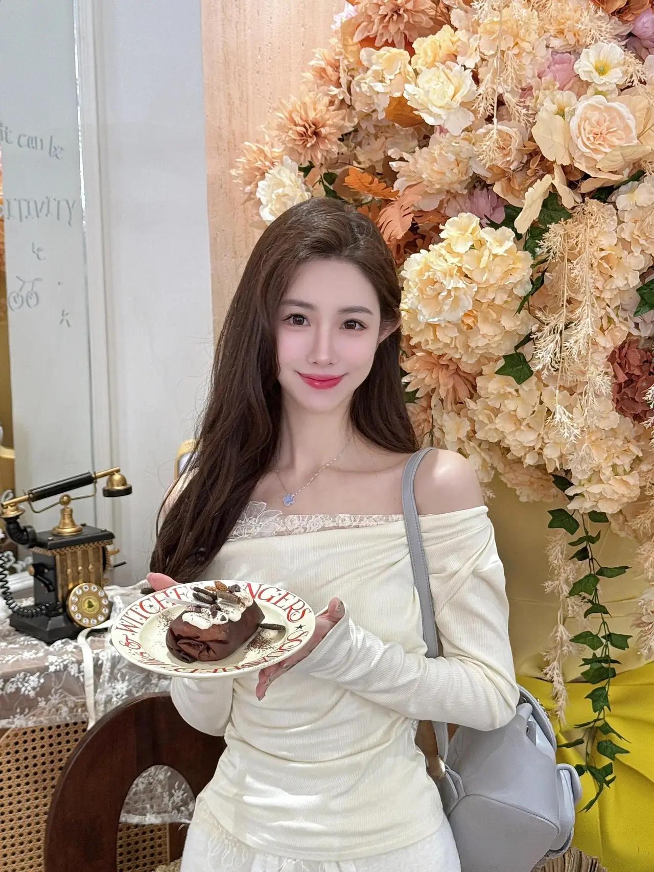 在这张精心装饰的环境中,一位女性正微笑着站在花墙前,仿佛置身于童话世界。她穿着一件白色长袖上衣,肩带的设计简洁大方,搭配同色系的下装,显得优雅而清爽。肩上斜挎的浅灰色包为整体造型增添了一抹低调的质感。她的手中托着一个白色盘子,盘子边缘点缀着醒目的红色字母,盘子里盛着一块诱人的巧克力蛋糕——奶油如云朵般轻盈,巧克力碎屑星星点点,仿佛在诉说着甜蜜的故事。 背景的花墙由粉色、黄色、白色的花朵交织而成,绿叶在缝隙中舒展,为画面注入了生机与浪漫。左侧的桌子上铺着精致的蕾丝桌布,一台复古黑色电话机静静伫立,仿佛在等待某个温暖的来电。整个场景散发着温馨与精致的气息,女性的笑容与手中的蛋糕相映成趣,仿佛这一刻的甜蜜不仅停留在味蕾,更融入了每一寸空气。