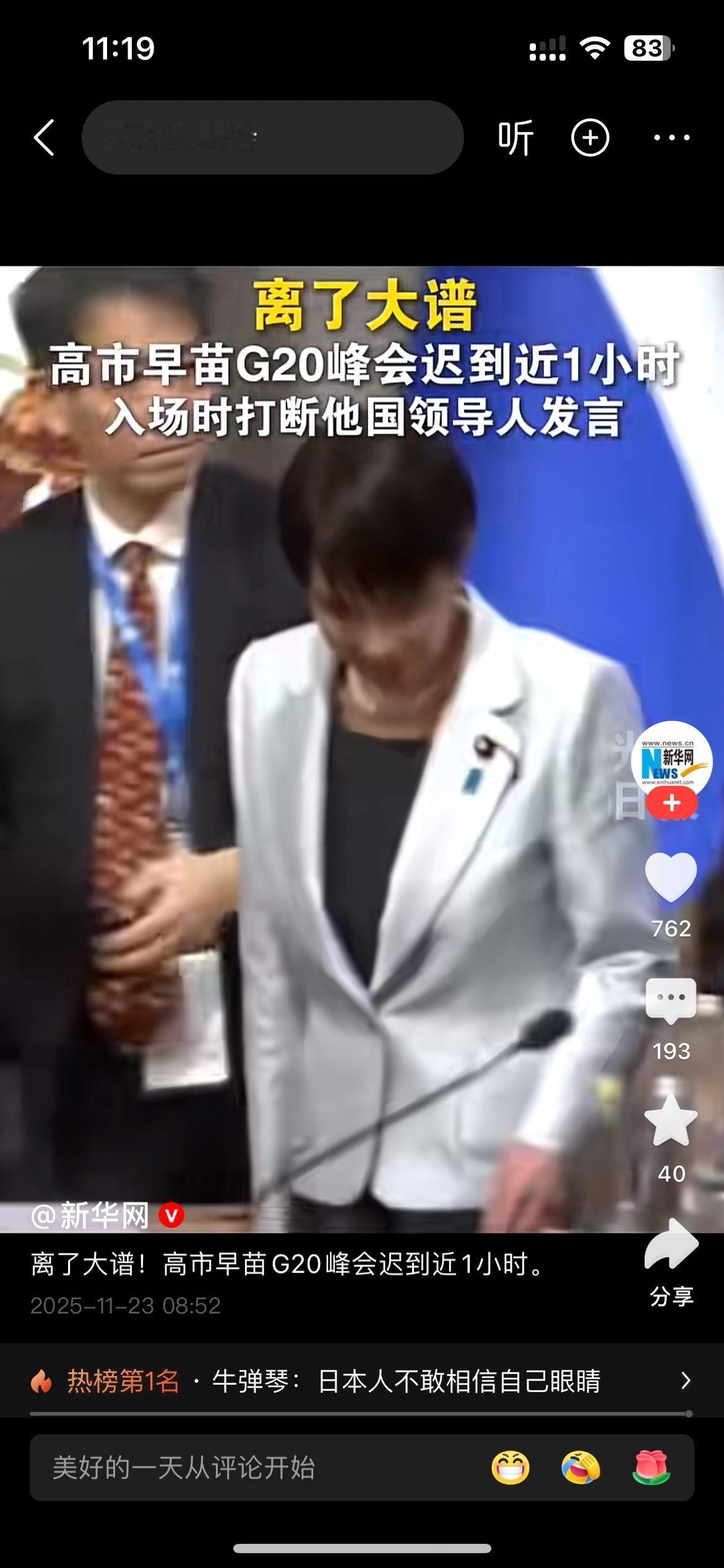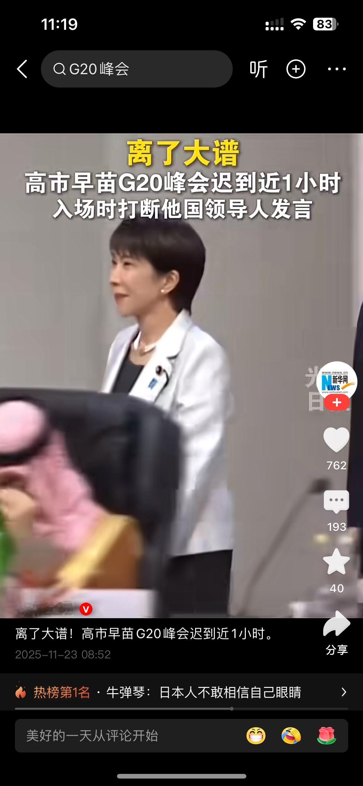 新华社的配音也是好熟悉的,让人突然想起来了电视上经典的抗日剧情中,熟悉的场景,“鬼子进村了”的配音。 可见现在的高市早苗的形象是多么的惹人嫌,竟然把这个配音给她用上了! 不过作为一国首相参加G20峰会这么正式的外交场合,竟然迟到近一个小时,并且进场时打断别国领导人发言,可见高市是多么的失礼!但人家却一点不在乎,依然趾高气昂,可见高市“脸皮之厚,实属罕见”。