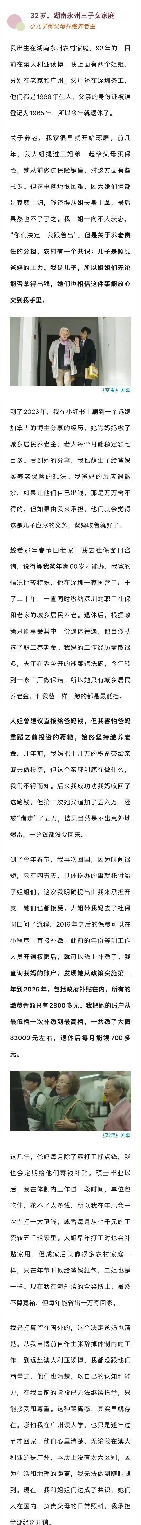 阎肃观察超话肃言肃语给农村父母补缴社保的年轻人 近年来,城乡居民养老保险参保人数不断减少,但农村60岁及以上人口占比已达22%,城乡居民基础养老金的最低标准仅有143元。面对这个困境,越来越多的年轻人选择主动接过担子,给操劳半生的长辈补缴养老金,提供一份每月到账的体面与安心。我们采访了三位子女,以下是他们的讲述。 实习记者|余雯彤 编辑|王海燕