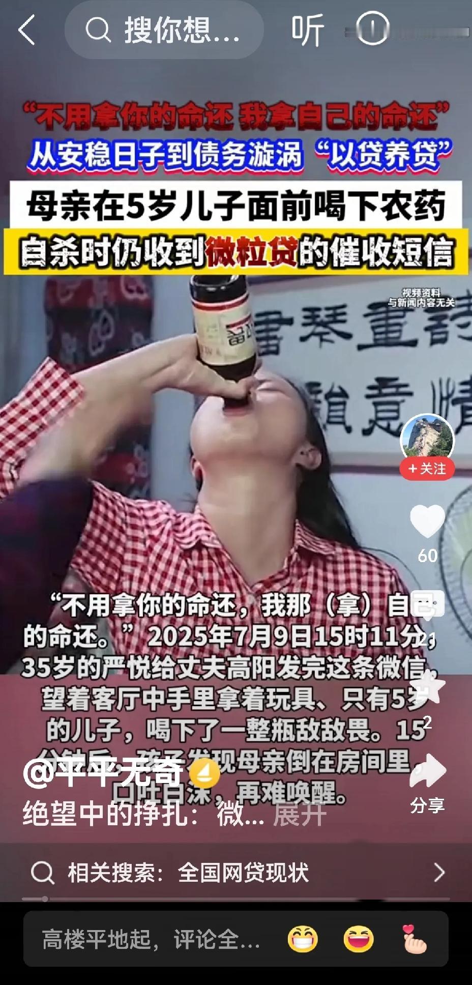 微粒贷催收阴影下 一位母亲的绝望与挣扎 近日,一则“微粒贷催收逼疯母亲”的视频引发热议 播放量超6000次,戳中了无数网友的痛点。视频背后,是普通家庭面对暴力催收的无助困境,更暴露了部分网贷平台催收环节的乱象。 当事人母亲只是借了笔钱周转,没想到等来的是不分昼夜的骚扰电话,言语威胁像针一样扎人,连亲友都被牵连进来。 原本想缓解生活压力的借贷,最后却成了摧毁家庭安宁的炸弹,好好的人被逼到精神崩溃,想想都让人窒息。 网贷的初衷是便民,可暴力催收早就越了法律和道德的线。监管明明早就禁止这种操作,为啥还有平台顶风作案? 说白了,还是监管落地有漏洞,部分平台把催收当成“逼债利器”,完全忘了金融服务该有的温度。 借债还钱天经地义,但催债不能没底线。咱们普通人借贷一定要量力而行,选合规平台,别被“便捷”冲昏头。 更希望平台能醒醒,催收不是恐吓,给借款人合理的缓冲空间,才是长久之道。 你身边有人遇到过暴力催收吗?如果是你,会怎么应对这种情况?