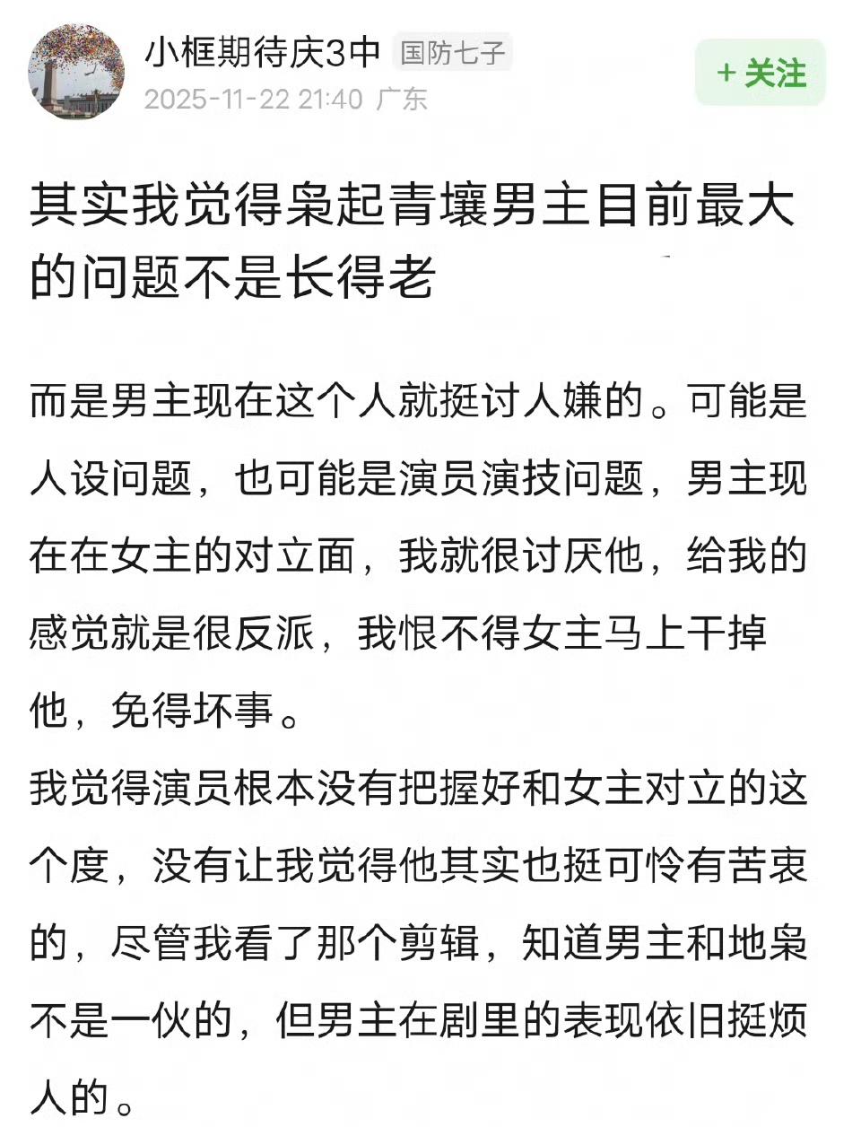 迪丽热巴新剧《枭起青壤》男主人设被网友吐槽了! 有觉得男主长相显老,再加上剧中的人设挺不让人喜欢的。 至于演技方面也是个问题,硬是把男主 演成一股给人反派的感觉。 就比如说开局男主对立面,双方没有把握好这个度,所以观众就恨不得开局送男主凉凉! 不过站在男主这边的人也不少,目前这部剧的热度还是挺高的,开播20分钟腾讯站内热度突破23000,1小时内冲至25000+,创2025年腾讯现代剧最快破2.5万纪录。