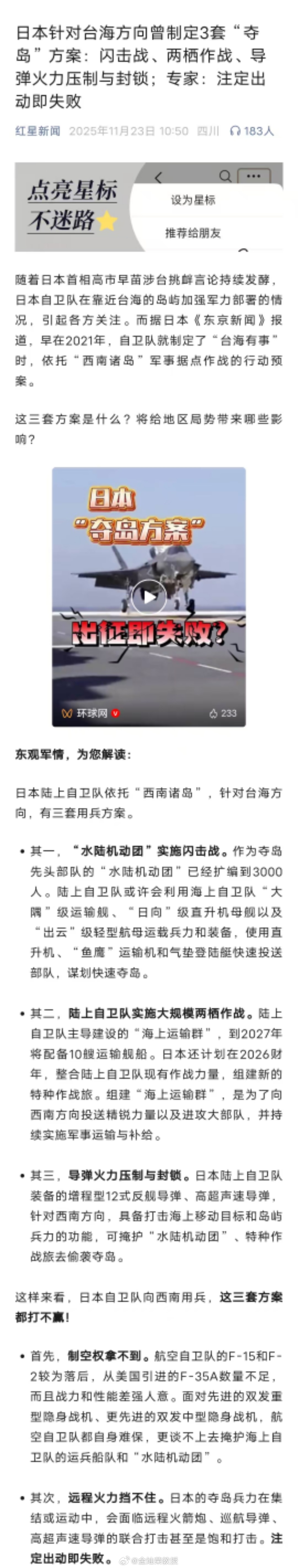 日本针对台海方向曾制定3套“夺岛”方案:闪击战、两栖作战、导弹火力压制与封锁