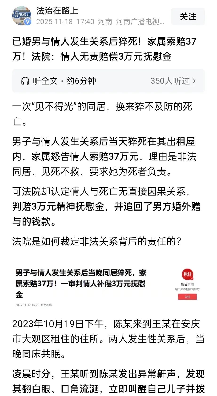 太离谱了! 安徽一男子婚内出轨还作死,胰腺手术后不听医嘱休养,感冒没好硬要和情人发生关系,刚完事就两眼一翻猝死了! 这哪是为爱冲动,分明是拿生命赌荒唐!医生早叮嘱过他体质差要静养,感冒一周反复不好还硬撑,情人劝他歇歇都不听,非要用行动“证明”自己,结果把命搭进去了。 家属转头就向情人索赔37万,简直离谱到家。好在法院查了聊天记录,证实情人劝过也尽了救治义务,判她不用担责,但因为同居违背公序良俗,赔了3万抚慰金。 这事真应了那句“不作死就不会死”,婚内出轨本就不道德,还无视身体警告逞强,最后害人害己。敬畏生命从来不是空话,更别拿健康换一时快活。