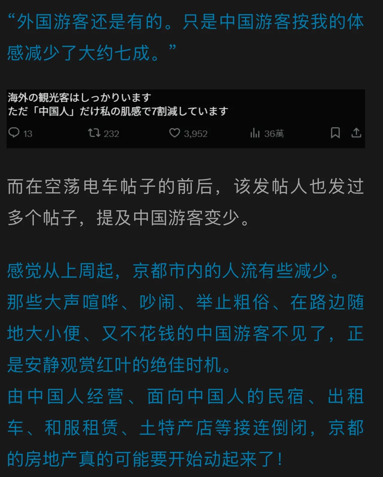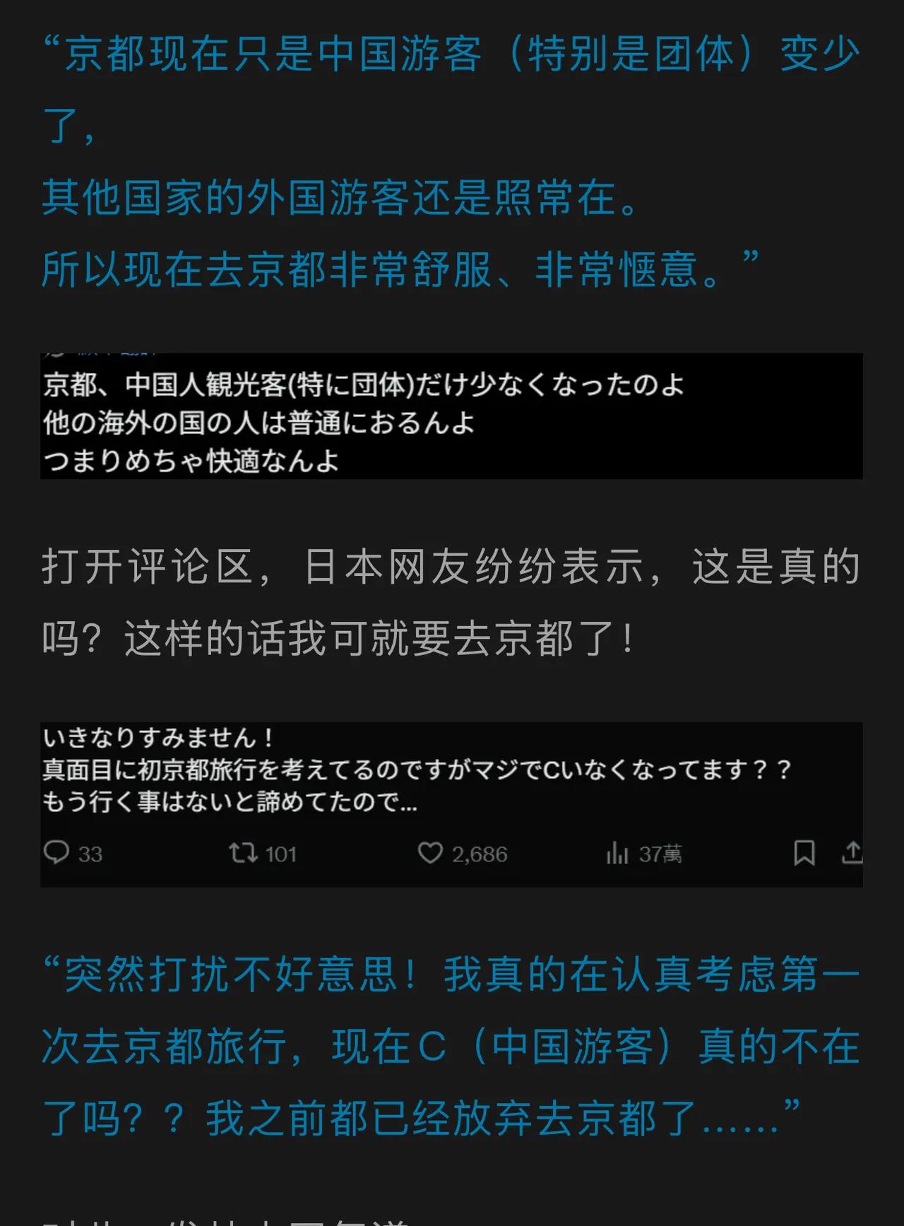 日本人这几天特别高兴,他们发现日本各大热门景点人少了七成,日本人说,中国人这些天不来日本,日本一下子变得舒服了! 有网友说:不怕挨揍,不怕有危险就去,这两天在日本街头出了好几起中国游客被打的事件,请国人别给国家添堵。 我们附近一个退休老师两口子去日本度假,大约去了两三个月,各种赞美日本,真可恶。 我们国家到处都是好山好水、好风景。要有骨气在囯内消费。 不去日本,太理智了。日本人也高兴不了太久了吧?旅游收入减少了,对日本也没有好处吧?日本物价会不会更高 我虽然没有人那么多钱,但我有骨气,我打死都不去日本旅游,祖国的大好河山,美丽风景才是我的踏足之地。 在目前中日关系紧张的时候再去日本旅游,真的该反思一下。 和平年代,尽量往友好方面发展,交恶对谁都没好处,不会动不动爱国上纲上线,真战争或经济战必定两败俱伤。 他们杀了我们三千多万同胞呀,为什么还去给他们送钱呢?老一辈先烈在天堂会怎么想呢? 对此你们怎么看呢?