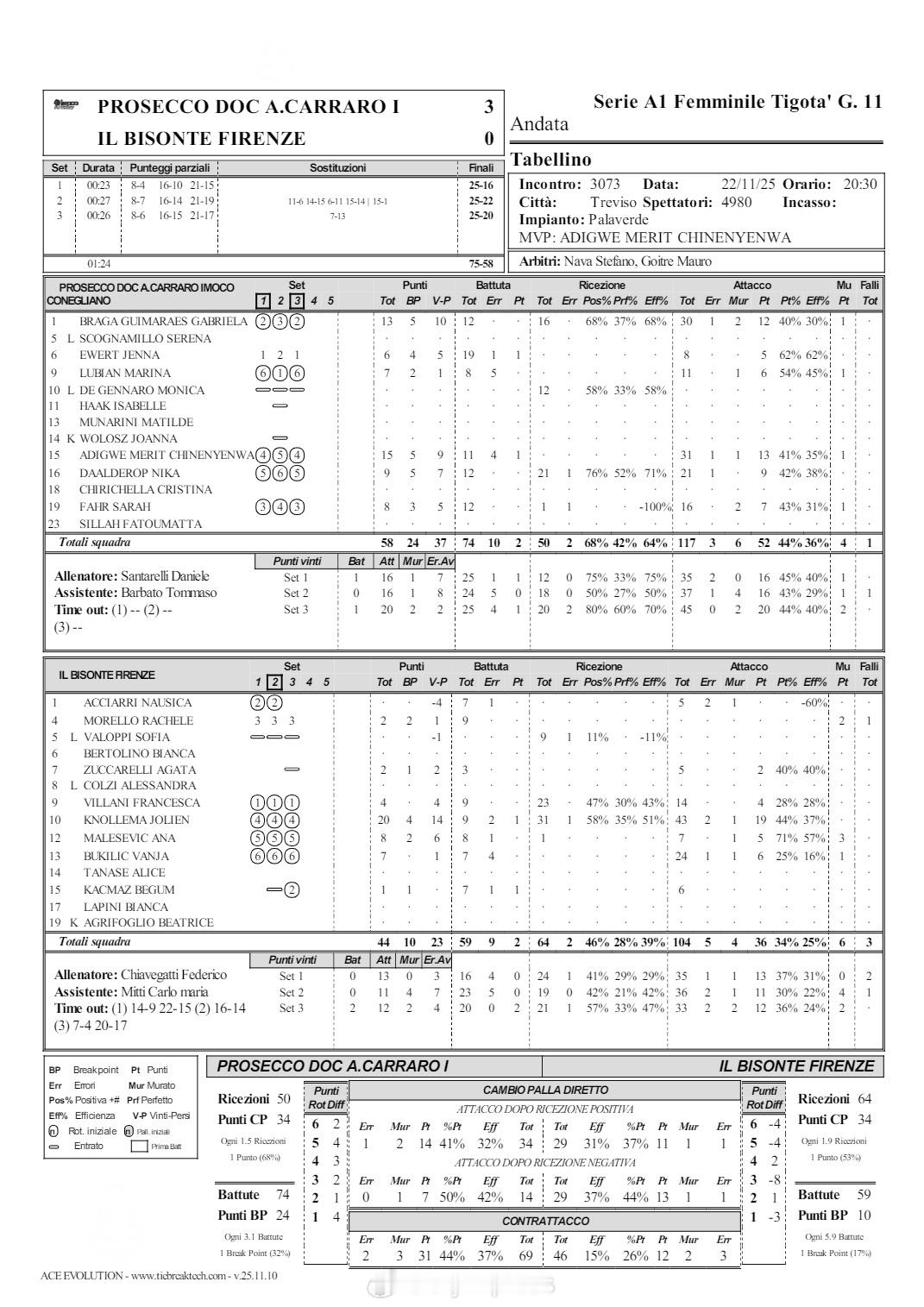 【意甲女排科内结束一周三赛 3-0完胜佛罗伦萨豪取13连胜】 11月22日,意甲女排第11轮,科内利亚诺结束了一周内的第三场比赛,在主场以3-0(25-16/25-22/25-20)轻取佛罗伦萨,取得13连胜。MVP阿迪维15分、加比13分、达尔德罗普9分,诺尔玛20分。本场替补出场的哈克在比赛间隙领取了10月MVP奖。