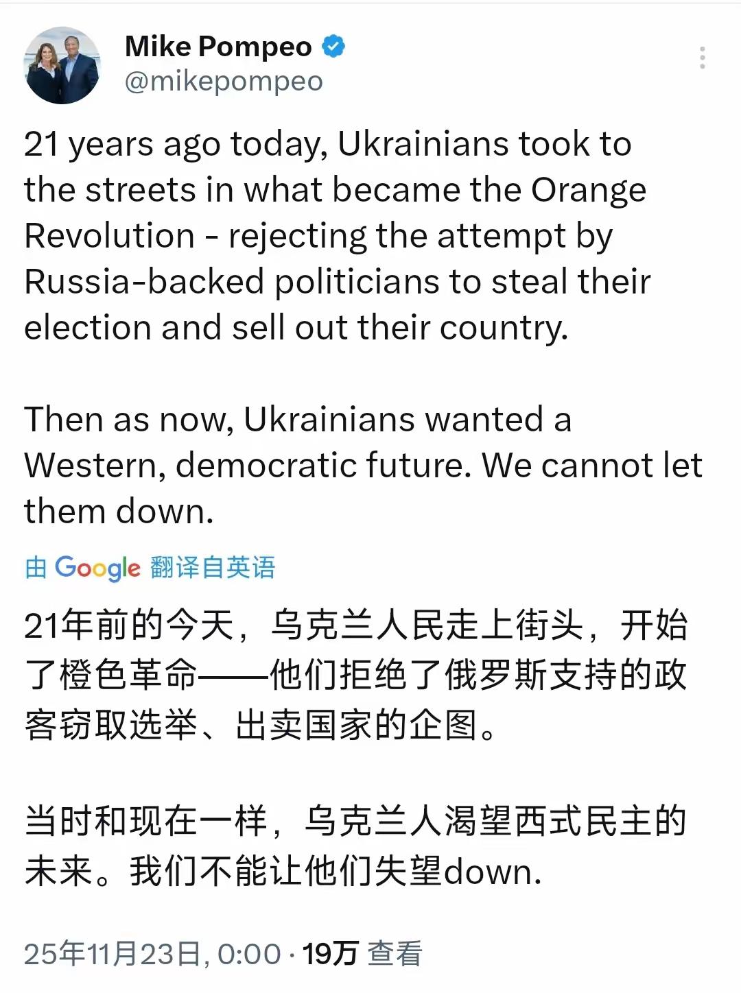 美国前国务卿蓬佩奥11月23日发文写道:“21年前的今天,乌克兰人民走向街头,开始了橙色革命,他们拒绝了俄罗斯支持者政客窃取选举,出卖国家的企图。当时和现在一样,乌克兰渴望西式民主未来。我们不能向他们失望”。 蓬佩奥真是厚颜无耻、不打自招,乌克兰内乱分裂,最后演变成俄乌冲突,甚至今天乌克兰面临国将不国、民不聊生的困境,正是美西方国家“拱火”的“颜色革命”使乌克兰内部分裂造成的。 而今,特朗普政府正在对乌克兰政策上从“战略支援”转变为“条件交易”的谈判筹码,以获取自己最大的政治利益。美国又何时真正为乌克兰人民的主权、民主、民生真切利益考虑过呢? 其实,乌克兰也只是美国西方国出于地缘政治从自身利益出发,用来削弱俄罗斯实力的政治筹码而已,而泽连斯基当初甘心选择走这条路,也只能自食恶果。