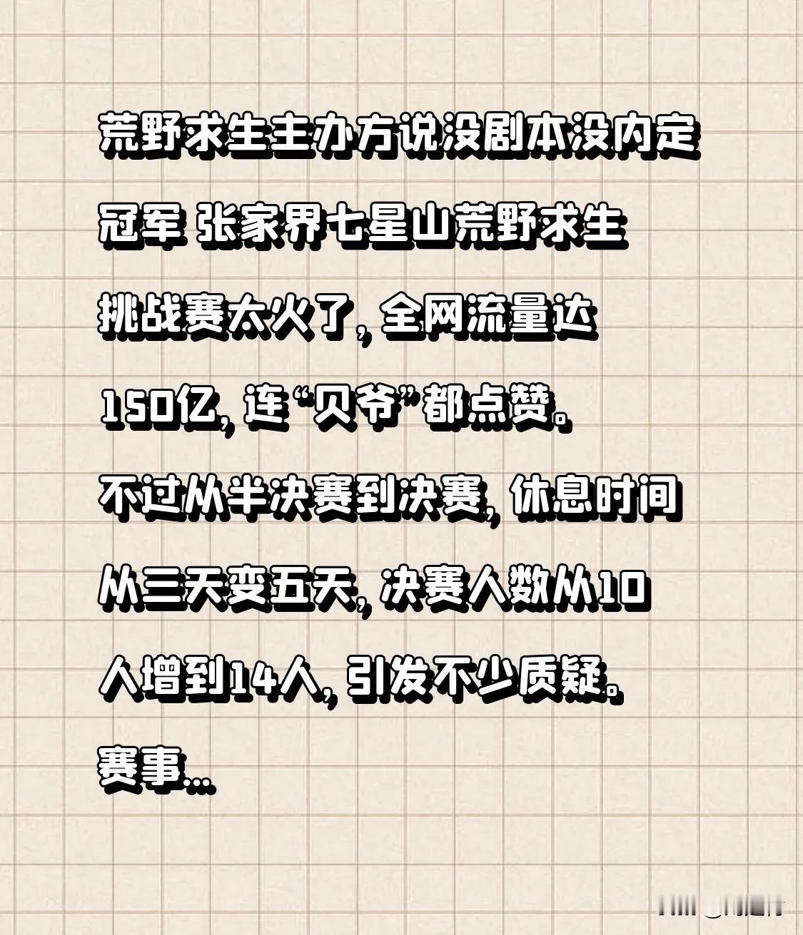 荒野求生主办方说没剧本没内定冠军 张家界七星山荒野求生挑战赛爆火,全网流量达150亿,连“贝爷”都点赞。然而,从半决赛到决赛,休息时间从三天延长至五天,决赛人数从10人增至14人,引发诸多质疑。 赛事主办方回应,比赛无剧本,也未内定冠军。景区总经理田健兵称,寒潮过后天气寒冷,凌晨气温降至零下,选手有失温风险,因此让14名选手都进入决赛。他强调,选手健康安全更重要,即便可能被指责犯规也在所不惜。他坚信赛事公正公平,经得起监督,也会对决赛选手的安全负责。 这场赛事热度不减,大家都在期待决赛冠军诞生! 荒野求生比赛 张家界户外求生 七星山荒野