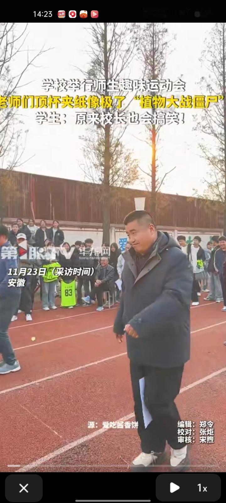 11月21日,宿州市萧县。学校举行师生趣味运动会,老师们头顶杯子腿夹纸,像极了“植物大战僵尸”,操场上笑声一片。学校王老师称,她和她爸爸都在这个学校上班,是同事,运动会是学校的传统项目,今年第36届了。“突然觉得这就是教育最温暖的样子,让学生们带着这种温暖去学习,比什么都值得”。