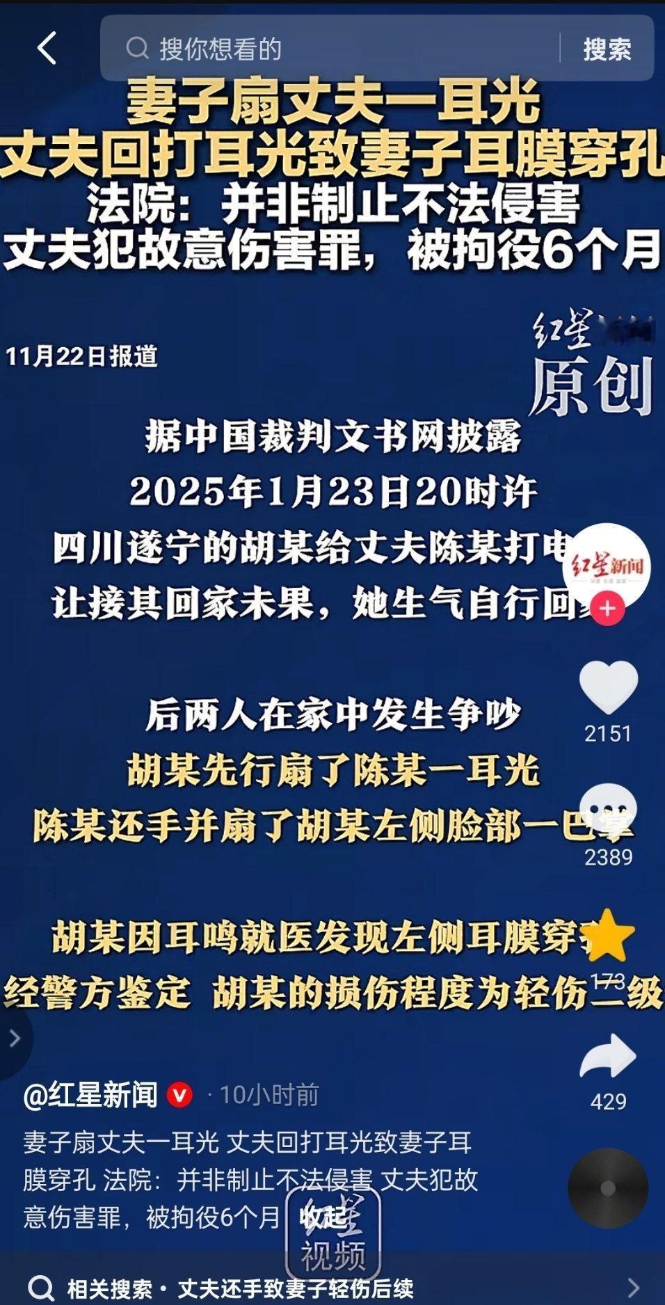 妻子扇丈夫一耳光,丈夫回打耳光致妻子耳膜穿孔。丈夫犯故意伤害罪,被拘役6个月。