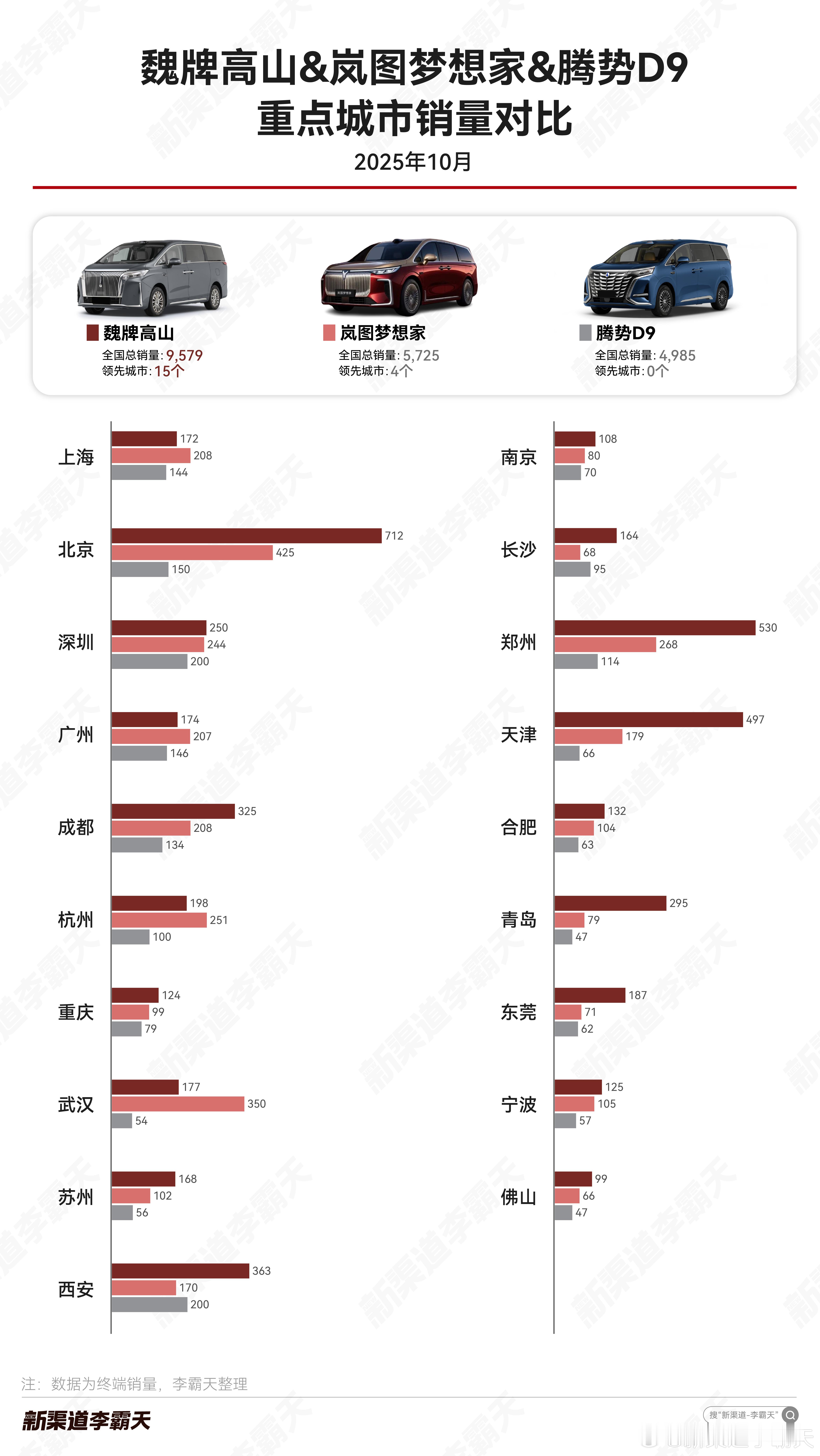 【高端插混MPV 10 月重点城市销量对比:魏牌高山成为新领跑者】高山凭借789的组合拳月销近万台,并在多数高线城市领先,而梦想家则在上海、杭州、武汉等4个城市有优势