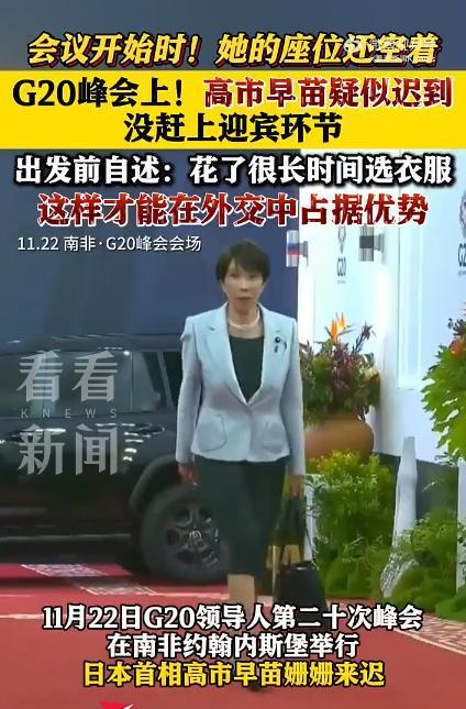 拘小节而无大礼,日本首相因挑选衣服迟到G20峰会1小时,这是把国际外交场当成时装秀场了吧? 在G20峰会现场,高市早苗的座位空了近一小时,直到别国领导人发言时才匆匆入场,国际镜头拍下这一尴尬场面。 前一天,她还发社交动态炫耀,花好几小时翻找衣服,就怕穿得廉价被小看,琢磨着靠衣服在谈判中占上风。 结果衣服挑明白了,外交最基本的守时却抛到脑后,所谓“拘小节而无大礼”,说的就是这种吧?实在难以想象这是一国首相能做出来的事情!