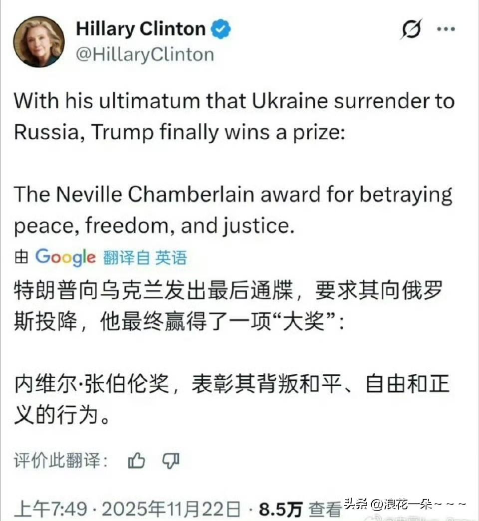 哇!这是都不服气啊?[捂脸] 这可咋办?美国自己鼓捣出来的俄乌28条停火协议简直要把欧洲政客们肺都气炸了?这不,法国海军参谋长开会直接爆粗口了(图一)! 可以看出,欧洲都上火了,又拿不出什么好办法来对付美国! 我看只能发发牢骚算了,除非欧盟发起反美运动并且乌克兰的泽连斯基拒不签署协议,也不要担心美国断情报断支援,先把27日特朗普的最后期限给破了打他一巴掌再说! 其实,民主党也不服气28条呢?你看人家希拉里怎么说的?