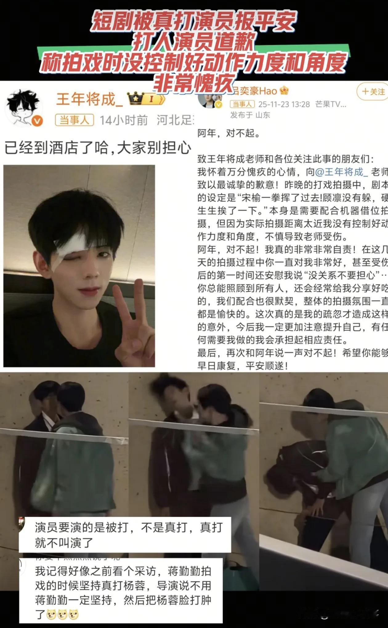 演员拍打戏,是否需要真打? 短剧被真打演员报平安,打人演员道歉,称非常愧疚,没掌握好力度。 网友:演员要演的是被打,不是真打,真打就不叫演了。 网友:我记得好像之前看个采访,蒋勤勤拍戏的时候坚持真打杨蓉,导演说不用,蒋勤勤一定坚持,然后把杨蓉脸打肿了。