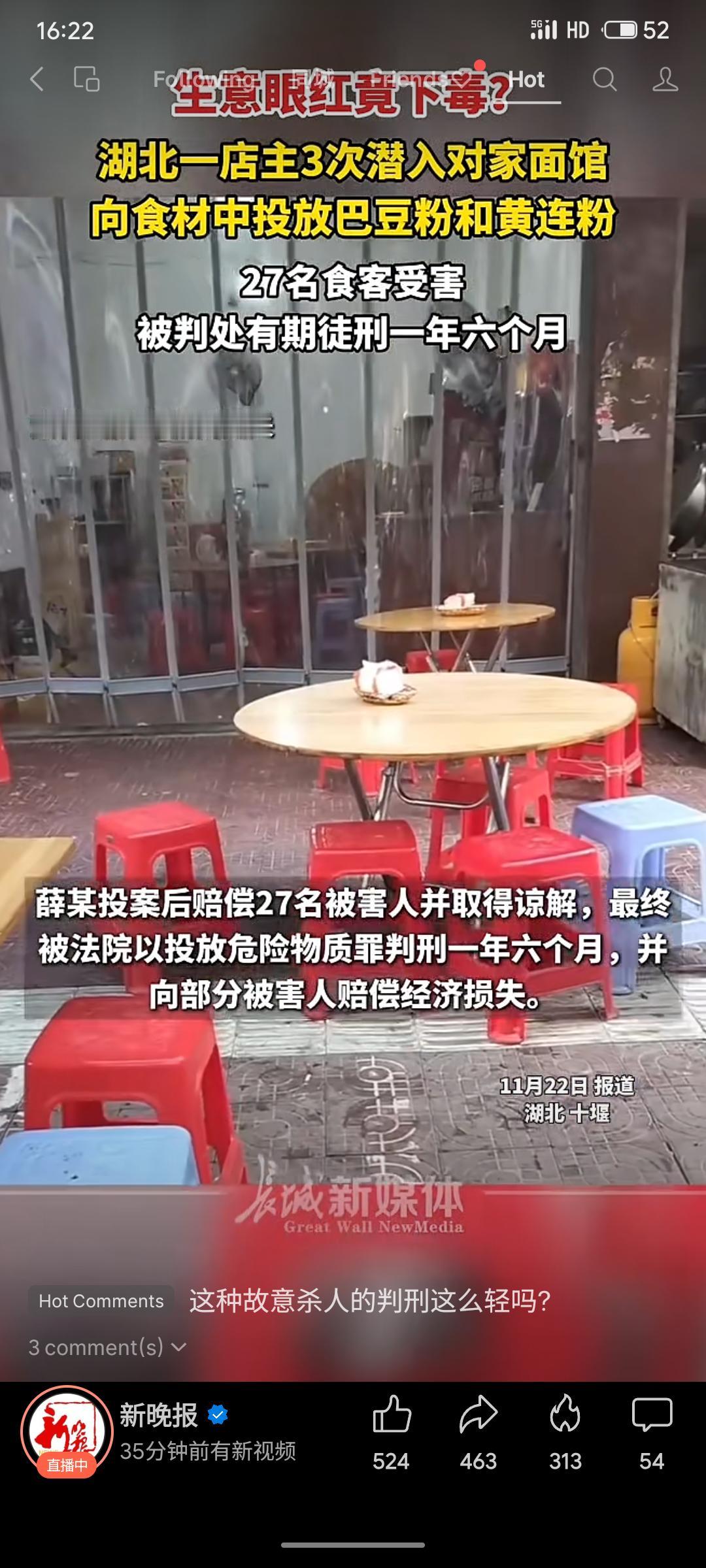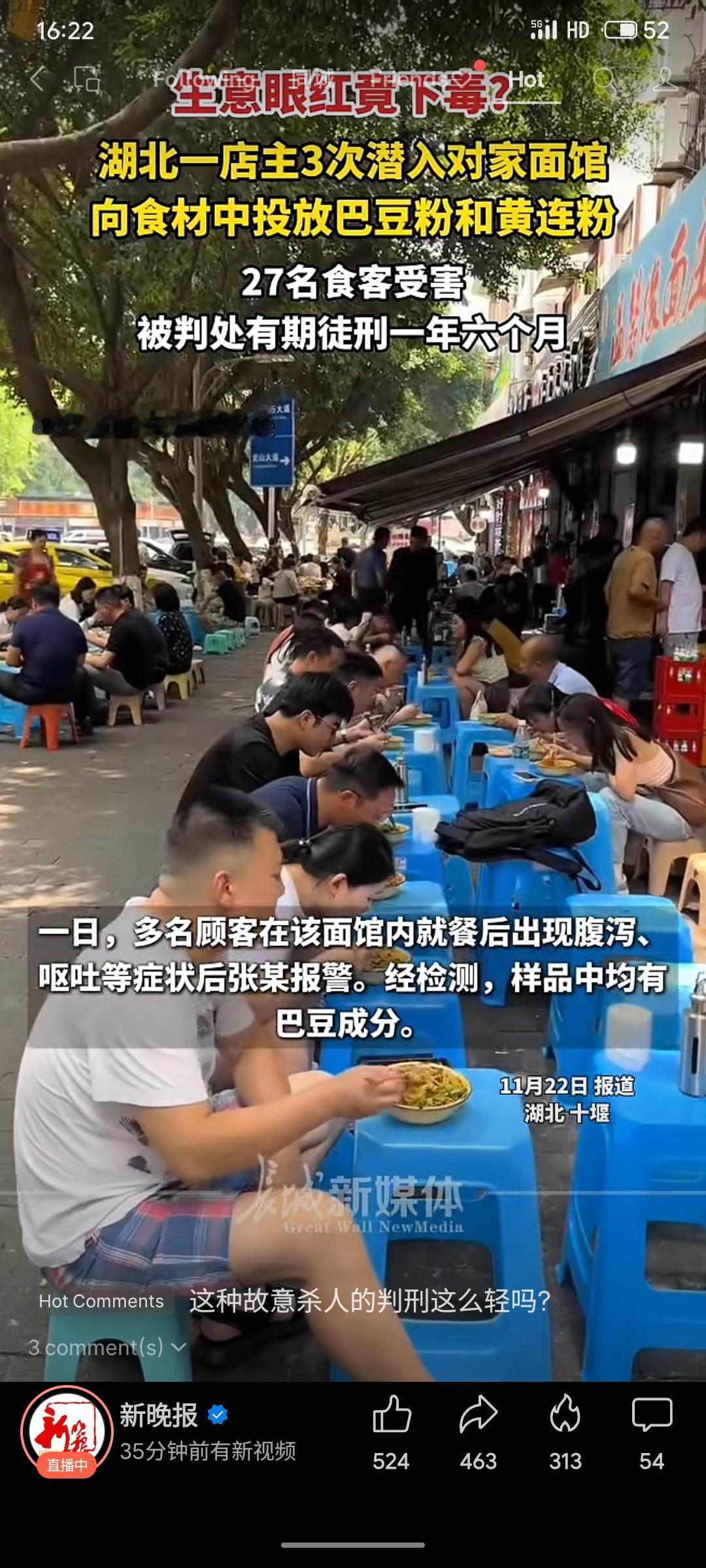 湖北十堰一店主薛某因商业竞争纠纷,三次潜入对面面馆向食材内投放巴豆粉与黄连粉,导致27名食客出现不良反应。薛某投案赔偿后获被害人谅解,最终以投放危险物质罪被判处有期徒刑一年六个月。
