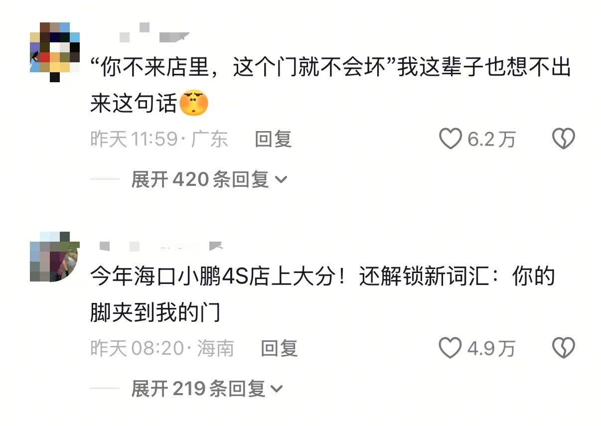 11月22日,潇湘晨报记者私信了发布视频男子,截至发稿暂未收到回复。在视频评论区,网友纷纷谴责4S店处置不当。“‘你不来店里,这个门就不会坏’,我这辈子也想不出来这句话”、“今年海口小鹏4S店上大分!还解锁新词汇:你的脚夹到我的门”……