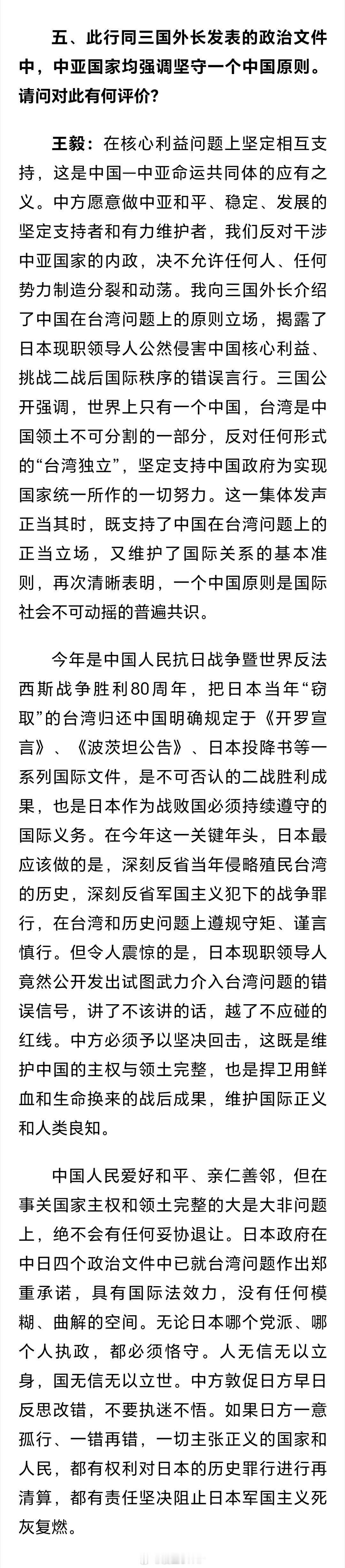 王主任:日本现职领导人竟然公开发出试图武力介入台湾问题的错误信号,讲了不该讲的话,越了不应碰的红线。中方必须予以坚决回击,这既是维护中国的主权与领土完整,也是捍卫用鲜血和生命换来的战后成果,维护国际正义和人类良知。