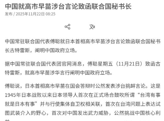 中国给联合国各成员国打招呼了!该表明的立场,我们提前表明了,如果真要是动手,我们将具备完全的正当性!11月22日,根据外媒报道,中国就高市早苗涉台言论一事已经致函联合国秘书长。我们的傅聪大使表示,如日本胆敢武力介入台海局势,将构成侵略行为,中国将坚决行使《联合国宪章》和国际法赋予的自卫权,坚定捍卫国家主权和领土完整。   高市早苗公然在国会宣称,“台湾有事”可能构成日本能行使集体自卫权的“存亡危机事态”,明晃晃暗示要武力插手台海。更气人的是,面对中国的强烈抗议,她非但不撤回言论,还狡辩这只是“个人观点”。   中国驻联合国代表傅聪大使没客气,直接把话捅到联合国。这步棋走得稳准狠,相当于当着全世界的面给日本划下红线。毕竟联合国不是自家客厅,在这里表态,就是要让所有成员国都听清楚、记明白,中国在台湾问题上的底线在哪。   要知道日本在台湾问题上本就没资格说三道四,历史上,日本曾对台湾进行过半个世纪的殖民统治,双手沾满了中国人民的鲜血。《开罗宣言》《波茨坦公告》白纸黑字写着台湾归还中国,这是二战后国际秩序的重要组成部分。现在高市早苗跳出来搞事情,简直是在翻历史旧账,往中国人民的伤口上撒盐。   联合国很快就给出了明确态度,秘书长发言人迪雅里克直接重申,基于联合国大会第2758号决议,台湾是中国领土的一部分,中华人民共和国政府是代表全中国的唯一合法政府。这话等于给中国的立场盖了权威印章,也狠狠打了高市早苗的脸。   更有意思的是日本政府的反应。外务省连忙派官员跑到中国,说高市的发言“没改变日方一贯立场”。这种辩解纯属自欺欺人。首相的公开言论都能不算数,那国际社会该信日本哪句话?这种前后矛盾的说法,只会让日本的外交信誉碎一地。   不光中国不答应,日本周边邻居也看不下去了。俄罗斯外交部直接给了差评,骂这是“复仇主义”,还宣布对30名日本相关人员实施无限期禁令。韩国国会议长禹元植公开喊话,让日本在历史问题上真诚反省,警告它修宪扩军是威胁东亚和平。朝鲜更直接,干脆回绝了和日本的所有对话,说不正视殖民历史的交流没意义。   高市早苗大概忘了,现在的中国早不是80年前的样子。当年日本军国主义能靠着坚船利炮侵占台湾,如今中国的航母编队已经形成战斗力,东风导弹能精准覆盖目标。我们不想动武,但也绝不怕动武,这就是傅聪大使强调“完全正当性”的底气。   就连日本国内都有不少批评声音。日本政界和舆论都在说,高市把国家拖进了“危机”,罪责深重。他们看得很清楚,跟着美国在台海煽风点火,最终只会把日本变成地缘冲突的炮灰。真要是爆发冲突,日本那些所谓的“安保措施”,根本挡不住中国捍卫主权的决心。   中国致函联合国,不是在搞威胁,而是在维护国际规则。我们提前把立场摆出来,就是不想有人揣着明白装糊涂,更不想有人重蹈历史覆辙。台湾问题是中国内政,这是国际社会公认的事实。   日本要是真敢跨过红线,别说国际法不答应,中国人民更不会答应。到时候我们行使自卫权,不管是联合国宪章还是历史正义,都站在我们这边。这一点,傅聪大使已经把话讲得明明白白,就看某些人听不听得进去了。