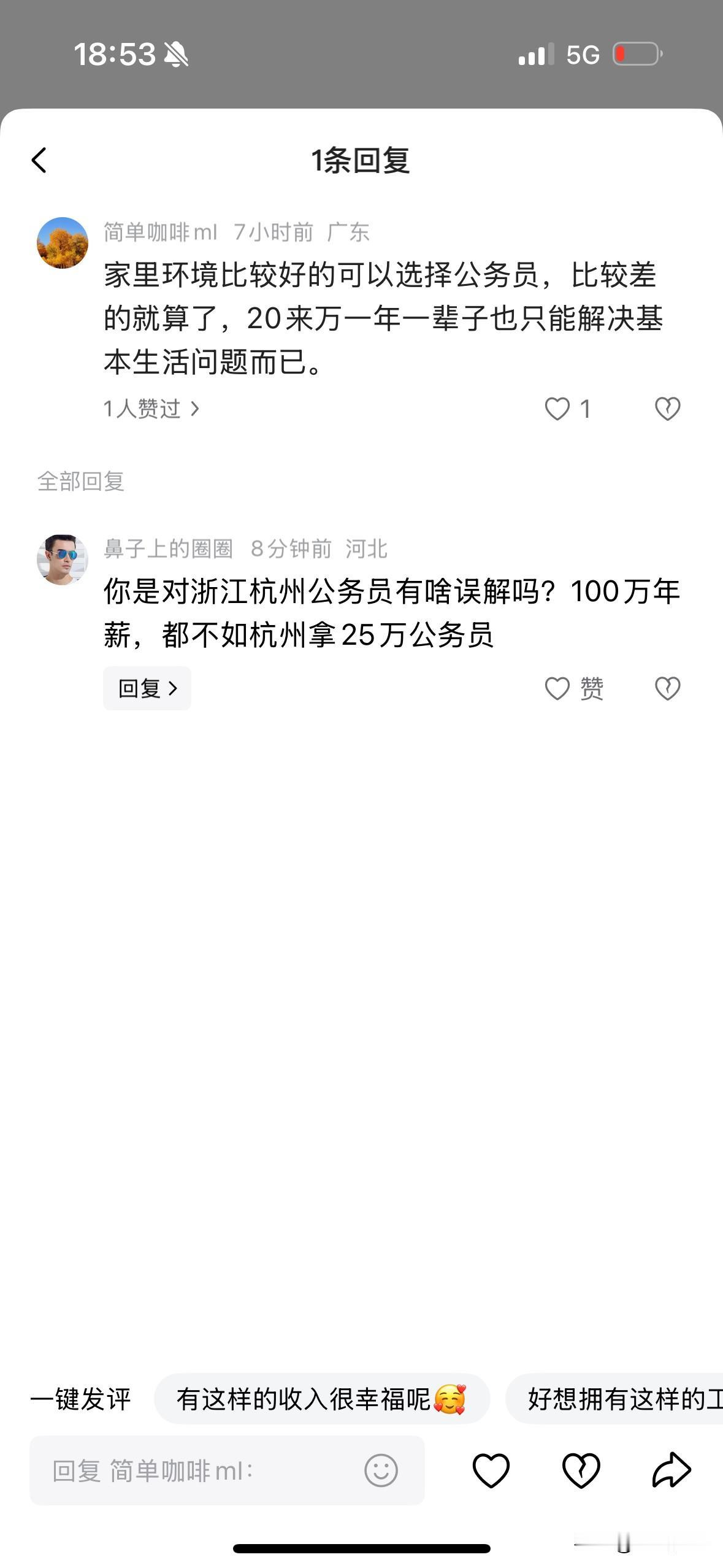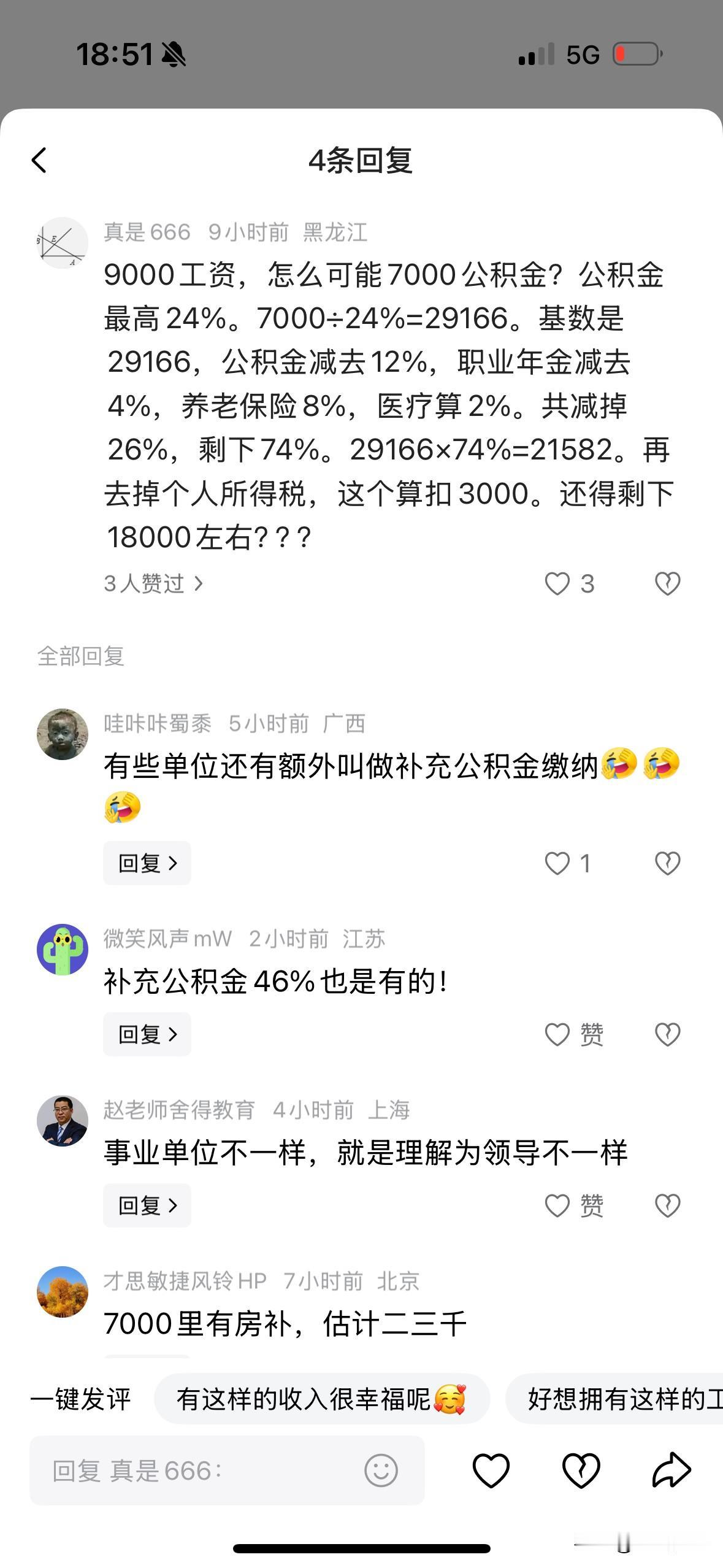 我哥们,上海985本硕,定向选调,在杭州市直单位。工龄6年。一个月到手9000。公积金加房补,一个月7000。年底有4万多绩效。 引发网友留言: 1、9000工资,怎么可能7000公积金?公积金最高24%。7000÷24%=29166。基数是29166,公积金减去12%,职业年金减去4%,养老保险8%,医疗算2%。共减掉26%,剩下74%。29166×74%=21582。再去掉个人所得税,这个算扣3000。还得剩下18000左右? 2、市直的话,如果到手一月9000,公积金加房补才7000的话,那你就是胡编乱造来刷流量的。 3、家里环境比较好的可以选择公务员,比较差的就算了,20来万一年一辈子也只能解决基本生活问题而已。 4、你是对浙江杭州公务员有啥误解吗?100万年薪,都不如杭州拿25万公务员 你认为呢?