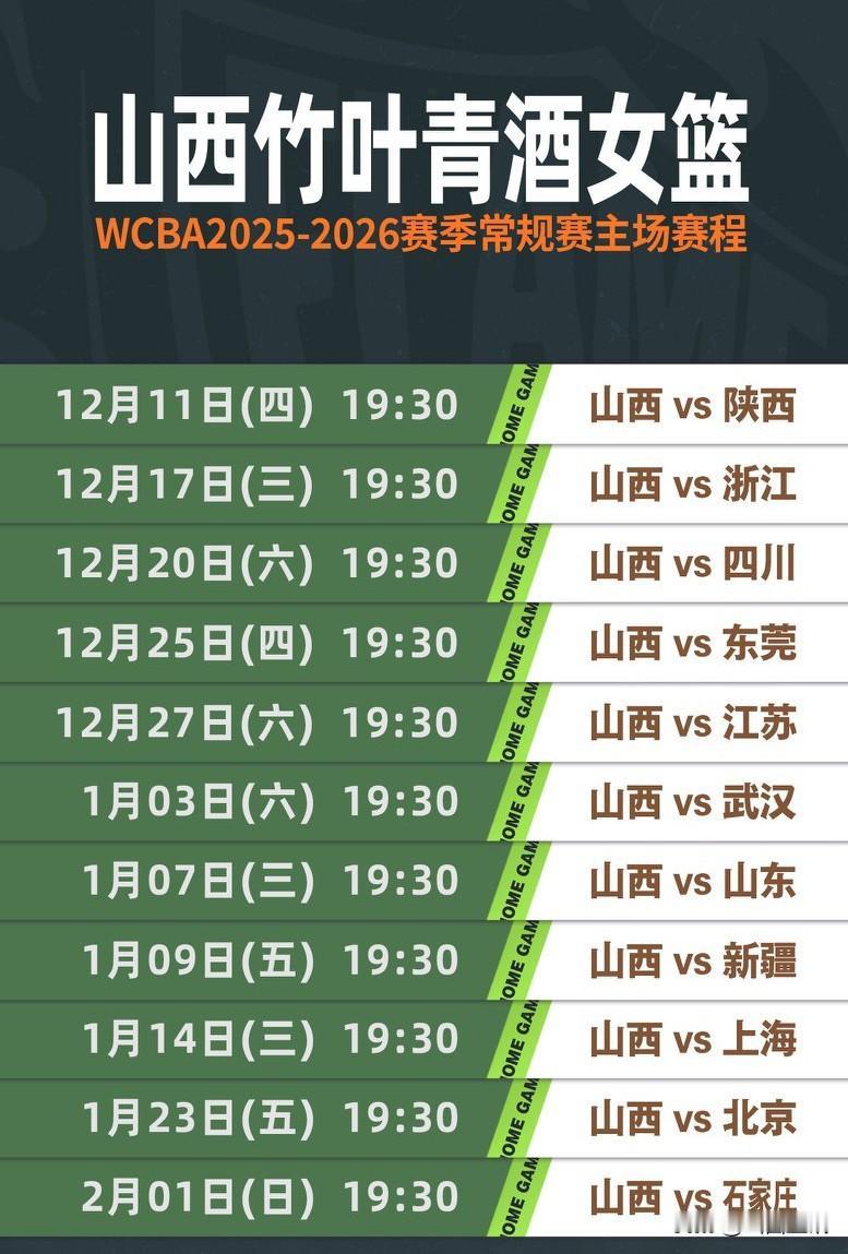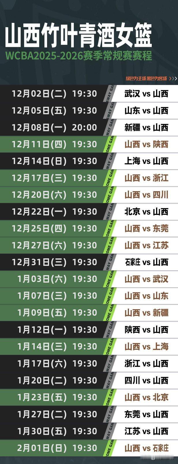 WCBA联赛2025-2026赛季常规赛及山西竹叶青酒女篮主场常规赛全部赛程。请球迷自行收藏,届时去主场为新赛季的山西竹叶青酒女篮加油!国家女篮五人篮球现役队员翟若云、张茹、陈玉婕和国家三人女篮队员张懿、刘帅等恭候您的莅临。关注山西篮讯,了解山西篮坛赛事!