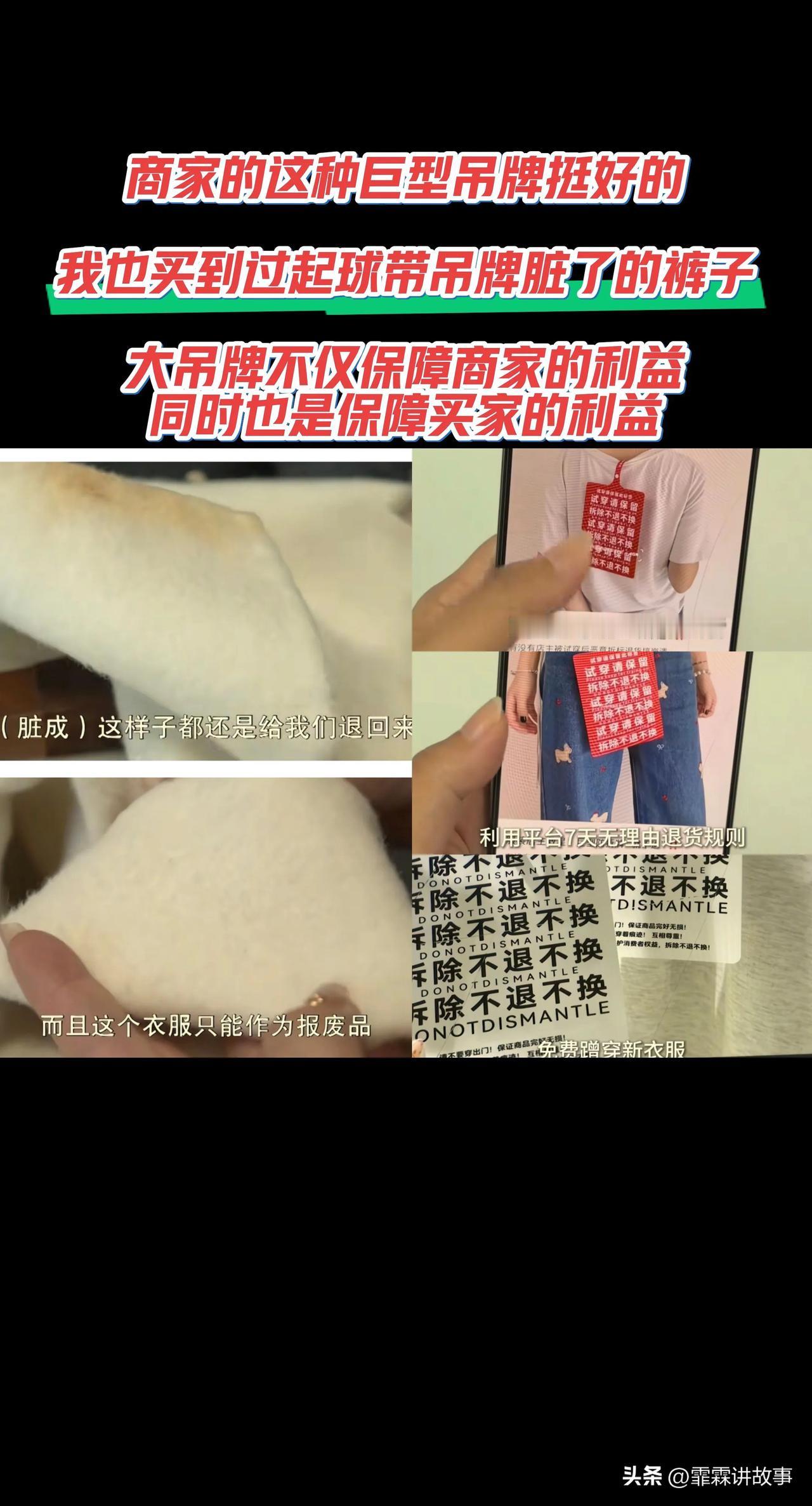 最近,一些巨型吊牌火了,因为经常有一些消费者,利用平台7天无理由退货规则,蹭穿衣服。 衣服穿的很脏无法售卖,还要退给商家,没办法商家们把小吊牌换成了巨型吊牌。 其实商家的这种巨型吊牌挺好的,我也买到过起球带吊牌脏了的裤子。 大吊牌不仅保障商家的利益,同时也是保障了买家的利益。
