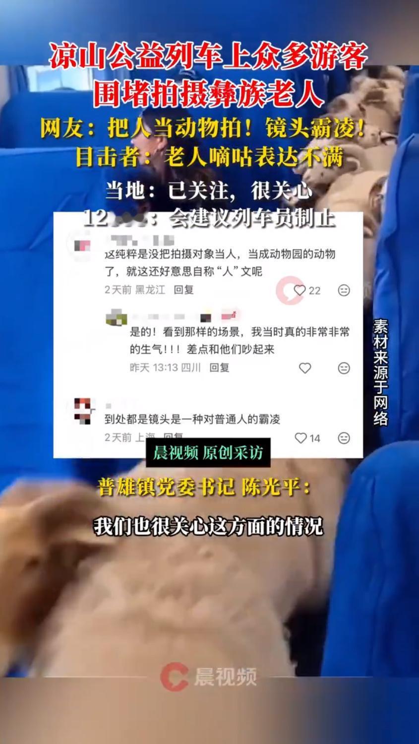 四川凉山那趟特别有名的5633次公益慢火车,最近因为一件事引发了全网愤怒。这趟车可是大凉山老乡们的便民车,最低票价才2块钱,开了几十年没涨价,不仅能拉人,还专门设了牲畜车厢、流动集市车厢,甚至有给孩子学习的车厢,彝汉双语广播、现金补票这些贴心服务全都有,90%的乘客都是当地彝族群众,大家靠着它赶集、上学、运输山货,早就成了山里人离不开的纽带。 可谁能想到,这么有温度的一趟车,居然出现了让人心里发堵的场景。有位网友乘车时,撞见一队二三十人的中老年旅行团,人手一台摄像机,像“长枪短炮”似的围着车上的彝族老人拍。其中一位穿特色服饰的阿婆,被围得水泄不通,嘴里一直嘀咕“怎么一直在拍?还在拍?”,明显透着不舒服,但这些游客完全没当回事。还有位背着背篓的阿婆,实在受不了就转过身捂脸说“不要拍”,结果游客们还是接着拍,有的人甚至开着闪光灯凑得更近,简直把老人当成了免费展品。 更让人无语的是,当时有列车员经过,看到这一幕没想着制止,反而调侃了一句“你们这些长枪短炮”,这波操作被网友吐槽是“变相纵容”。目击者气得不行,直言这些游客就是欺负老乡们语言不通,不会强硬拒绝,才这么肆意妄为。她把这事发到网上后,很快就炸了锅,网友们纷纷怒斥这哪里是“记录生活”,分明是赤裸裸的“镜头霸凌”,打着旅行摄影的旗号,却连最基本的尊重都没有。 事情发酵后,不少人都去问12306,客服回应说会核实情况,还表示会建议列车员下次遇到类似情况主动制止,但也坦言目前车上没有明确规定要制止摄影行为。当地镇政府也说已经关注到了舆情,会重视这件事。 网友们看完回应更不淡定了,有人吐槽“旅行的意义是看风景修身心,不是把别人当背景板冒犯”,还有人说“尊重比拍照重要一万倍,人家不愿意还硬拍,跟偷窥有啥区别”。大家之所以这么愤怒,是因为这趟慢火车承载的是公益和温情,游客们来感受风土人情没问题,但不能越过边界。这些彝族老人可能一辈子没怎么接触过外人,面对镜头的围堵,除了嘀咕和转身躲避,根本不知道怎么反抗,而这种“以记录为名的伤害”,比任何不礼貌的行为都更伤人。 其实不管是旅行还是摄影,核心都是相互尊重,不能因为对方淳朴善良、不善表达,就无视人家的意愿。这趟慢火车的温情值得被珍惜,山里人的淳朴更不该被消费,希望这事儿能给所有出门在外的游客提个醒,拍照前先问一句“可以吗”,不是多难的事,却是最基本的教养。 来源:晨视频
