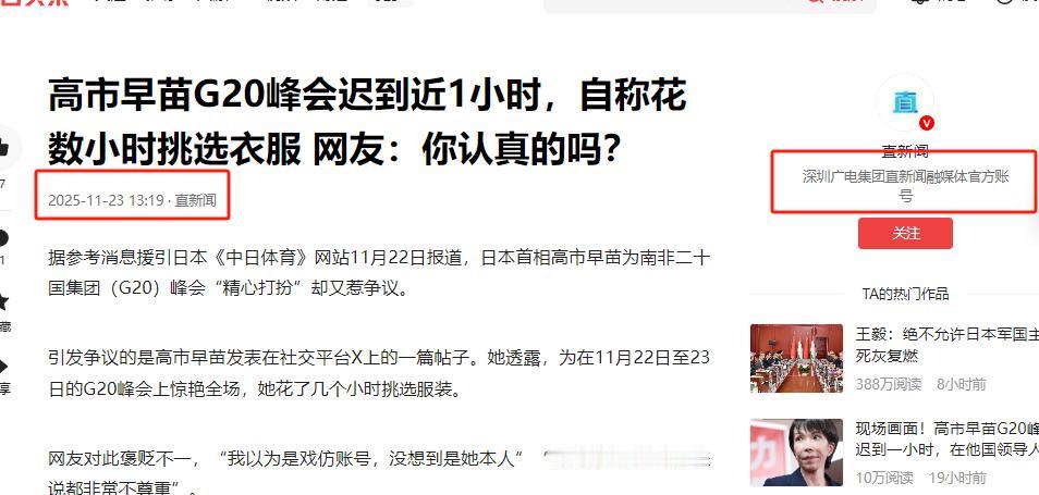 高市早苗G20峰会迟到近1小时,自称花数小时挑选衣服 网友:你认真的吗? 高市早苗这趟去约翰内斯堡开G20,本来是想在国际大场合“撑起日本存在感”,结果还没开口谈议题,先靠一条X帖子把自己送上了舆论审判席。 日本媒体披露,出发前她专门发长文自曝为了峰会“惊艳全场”,花了好几个小时挑衣服,还把这事说得极其郑重,好像外交成败就挂在衣架上。 大家好,欢迎来到只说真话的【真言科】[呲牙],我们接着聊: 问题不在她换没换衣服,而在于她说话的逻辑透露出的那股味道,既狭隘又市侩。 她引用参政党干事长安藤裕的说法,强调和外国领导人对话必须穿日本顶级面料、名匠手作的衣服,否则会被瞧不起;她自己也跟着点头称“很有道理”,于是才“咬牙买些好衣服”,力求既不显廉价、又不让人看低。 整段话听起来不像一个国家首相在说外交准备,更像一个急着挤进上流社交场的人在做形象包装。 难怪日本网友看完直接炸锅:有人以为是恶搞账号,有人质问这对G20成员国是不是一种不尊重,还有人反问“外交的目的难道就是出风头吗”。 这种反应不是日本网民太苛刻,而是高市的表达触到了一个最基本的分寸,国际多边会议的礼仪核心是庄重与尊重,不是“穿贵一点就能压人一头”。 把“别让人瞧不起”挂在嘴边,等于坐实了她心里那套等级观:我得靠外表撑气场,我怕被轻视,我要用名牌当盾牌。 更讽刺的是,这条帖子出现的时间点太敏感。 高市刚因涉台言论把日本推到区域风口浪尖,日本外交本就处在被放大镜盯着的状态,G20对她来说是一场考验而不是秀场。 可她偏偏把注意力先放在“穿什么、会不会被笑话”上,给外界传递的信号只有一个:日本这位新首相对国际政治的理解,仍停留在“形象压倒内容”的浅层表演里。 大国外交从来不是靠衣服赢的,真正让人尊重的,是立场的可信度、政策的稳定性、以及对规则的敬畏。 你在议题上踩红线、在历史问题上玩火,再昂贵的布料也遮不住政治风险;你想在多边场合提高分量,靠的应该是解决问题的方案,而不是“看起来贵不贵”。 高市这一番“精心打扮论”,看似小事,实则把日本政坛某些人的焦虑暴露得一清二楚,越担心被世界轻视,就越急着用表面包装来挡住内里的空虚。 这样的心态走上G20舞台,只会让日本更像在找镜头,而不是在做外交。