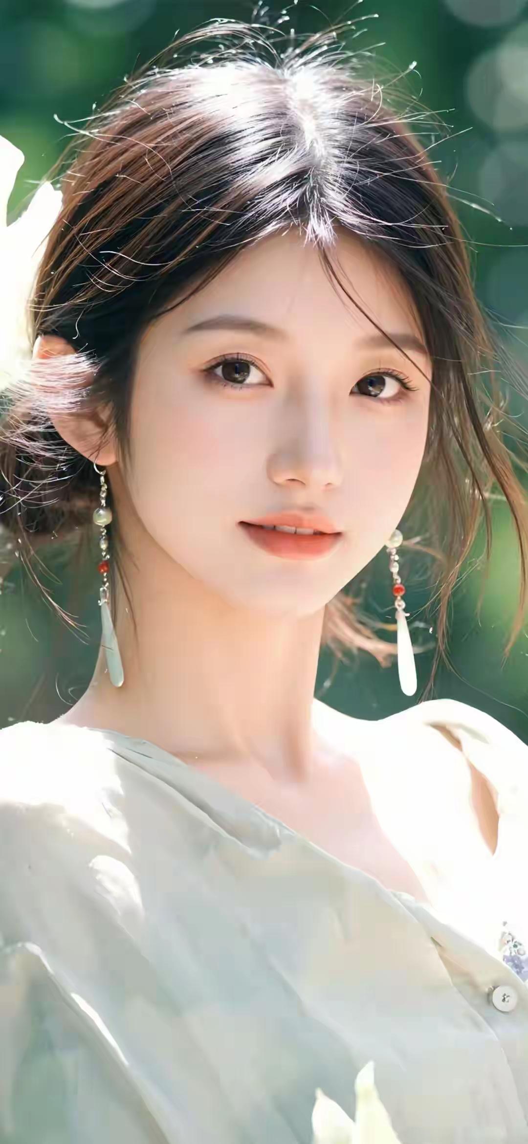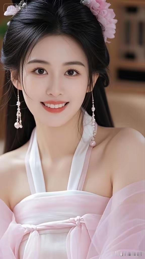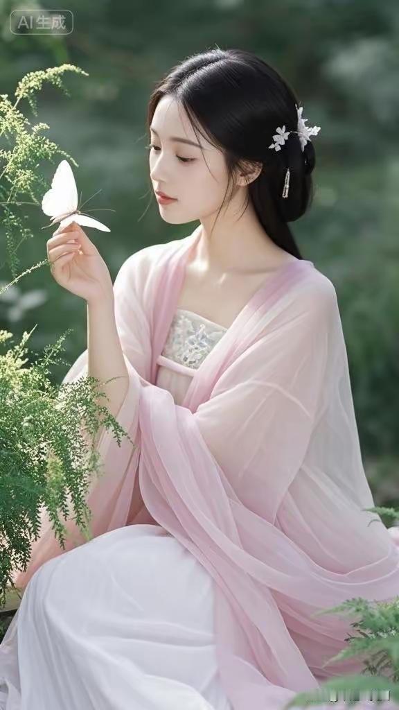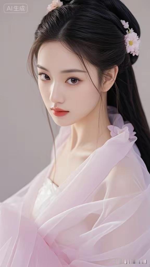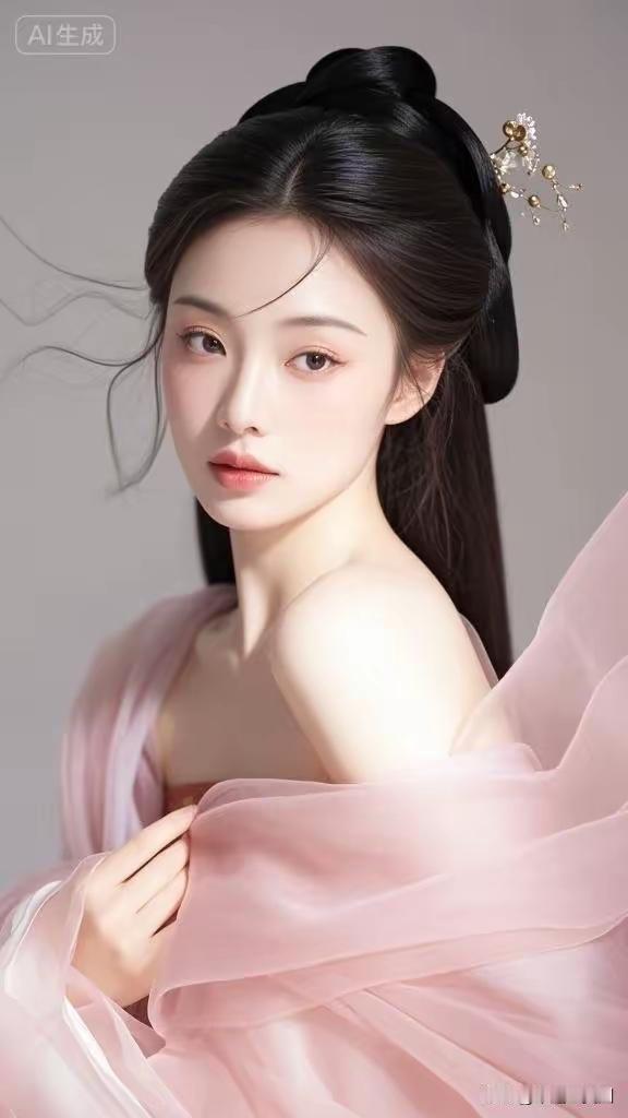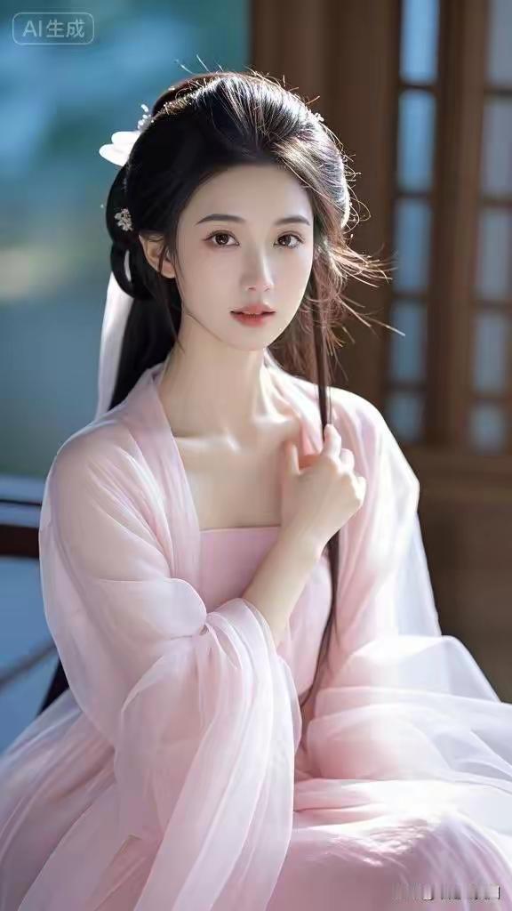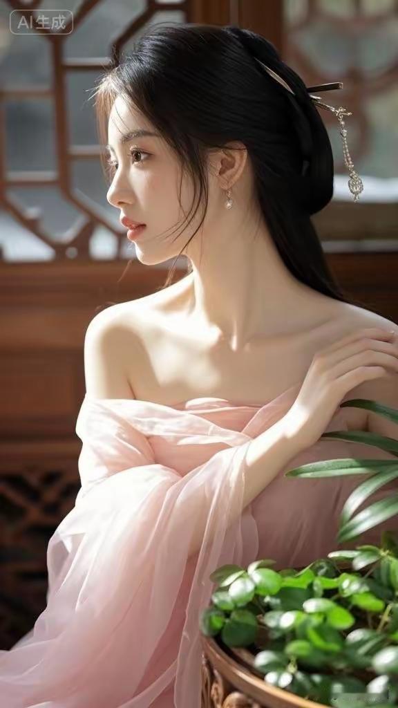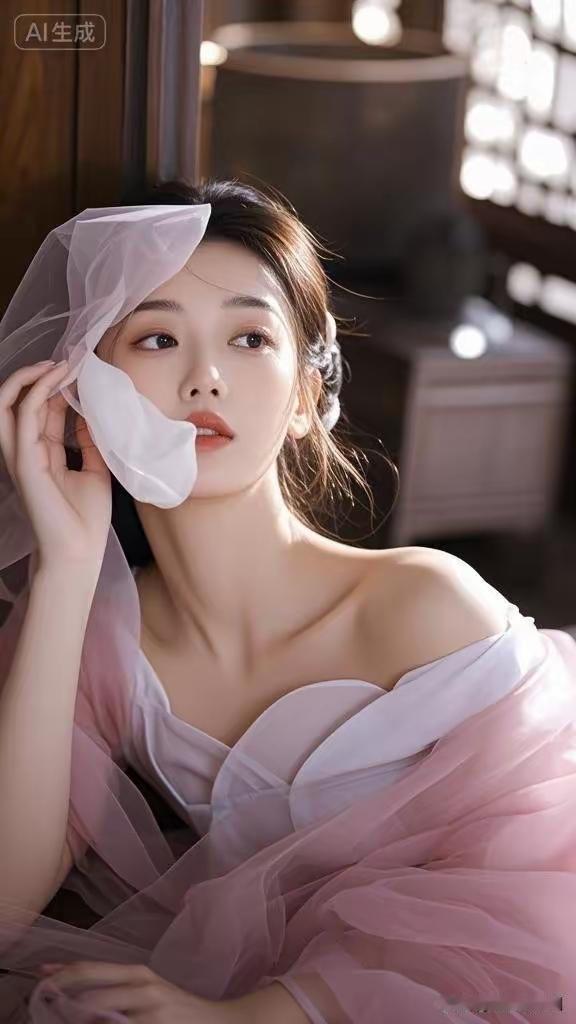 粉衣美人倚窗立,轻纱拂面似云烟。