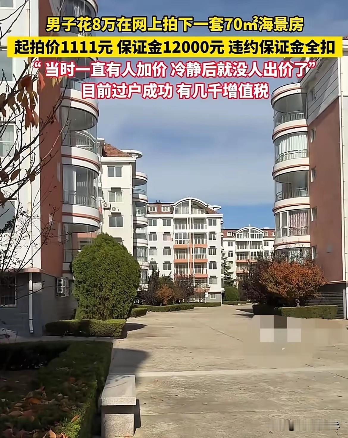 这胆量也没谁了!河南一男子,居然敢花8万多,从网上拍到一套海景房,位置在乳山,去一趟要跑900公里,网友认为他砸手里了! 最近河南一位大哥的操作火遍全网,仅凭手机上的拍卖页面,就敢花8万多拿下一套远在山东乳山的海景房,全程没实地看房,等付完钱才驱车900多公里去验房,消息传开后,网友几乎一边倒觉得这房子要砸手里。 事情要从半个月前说起,这位大哥平时就喜欢刷各类拍卖平台,偶然间刷到乳山银滩一套海景房的竞拍信息,1111元的起拍价瞬间勾住了他的注意力,粗略看了页面上的户型图和海景实拍,觉得性价比极高,当场就交了1.2万元保证金,想着能低价捡个漏。 没想到竞拍一开始就格外激烈,起初大家都是100元、200元慢慢加价,可中途突然触发平台自动加价规则,一次直接跳涨5万元,其他竞拍者也没停手,轮番出价僵持不下。 大哥当时胜负欲上来,加上担心放弃竞拍会损失保证金,一路跟拍到底,最终以7.9万元的价格成交,算上平台5%的交易佣金和各类税费,整套房子总成本达到8.4万元,折合下来每平米才1200元。 竞拍成功后,大哥和妻子特意抽时间自驾前往乳山验房,从河南出发一路开了900多公里,花了整整10个小时才抵达小区。 到地方后发现,房子是2006年建成的多层住宅,位于4楼且没有电梯,楼栋外观看着有些老旧,受海边海风盐雾侵蚀,外墙部分墙面已经出现斑驳痕迹 。 打开房门后,内部状况比预期稍好,装修是早年的简约风格,保持得还算干净整洁,沙发、床、空调等基础家具家电都随房赠送,不用额外添置就能简单入住。 不过所谓的“海景房”并没有想象中惊艳,窗户对着一片荒滩,只有涨潮的时候才能勉强看到一小片海面,退潮后眼前全是裸露的滩涂,和平台宣传的“一线海景”差距不小。 小区里的居住氛围也很特殊,当天逛下来没遇到几个住户,只有零星几位老人在楼下散步,周边商铺大多处于关门状态,仅有的一家小超市商品种类也很单一。 询问周边住户得知,这里属于典型的“候鸟式社区”,夏天会有不少外地游客过来避暑度假,小区里能热闹些,可一到冬天就几乎人去楼空,常住居民寥寥无几,空置率能达到70%以上。 更让人头疼的是配套问题,小区附近没有大型商场和正规医院,日常买菜购物得去几公里外的临时集市,要是有就医需求,还得驱车十几公里赶往乳山市区,交通也不太方便,周边公交线路稀少,等待时间动辄半小时以上,没有私家车出行很不便。 最让大哥意外的是,当地中介得知他8.4万拿下这套房后,直言这个价格并不算捡漏。中介透露,现在乳山银滩的二手房市场格外低迷,房源严重供过于求,90%的房产都是外地投资客持有,本地几乎没有居住需求,大量房源积压卖不出去,价格一路走低。 同区域位置稍偏的房源,5万元左右就能拿下,就算是靠近核心商圈或海边的房子,8万也能选到户型更好、配套更全的,像他这套无电梯、海景一般的房子,实际合理价格也就6万上下。 而且这类老房子后续维护成本不低,墙体渗水、管道老化是常见问题,加上没有集中供暖,冬天只能靠电暖器取暖,每月电费都是一笔不小的开支。 消息传到网上后,网友议论纷纷,不少人觉得大哥冲动了,没有实地考察就盲目竞拍,后续不管是自住还是出租都不划算,大概率要砸在手里。 也有少数网友觉得,8万多能拥有一套海景房,偶尔过来度假住住也不错,不用纠结性价比。 对此,你们有什么看法,欢迎评论留言~