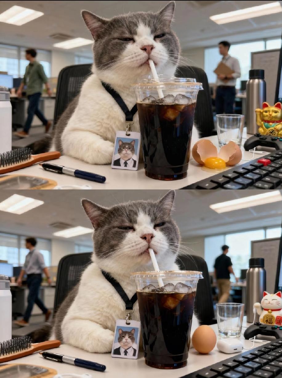 这猫上班比我还会摸鱼!喝冰饮、摆烂瘫桌,细节里藏了多少不同?我先找了3处,你呢?