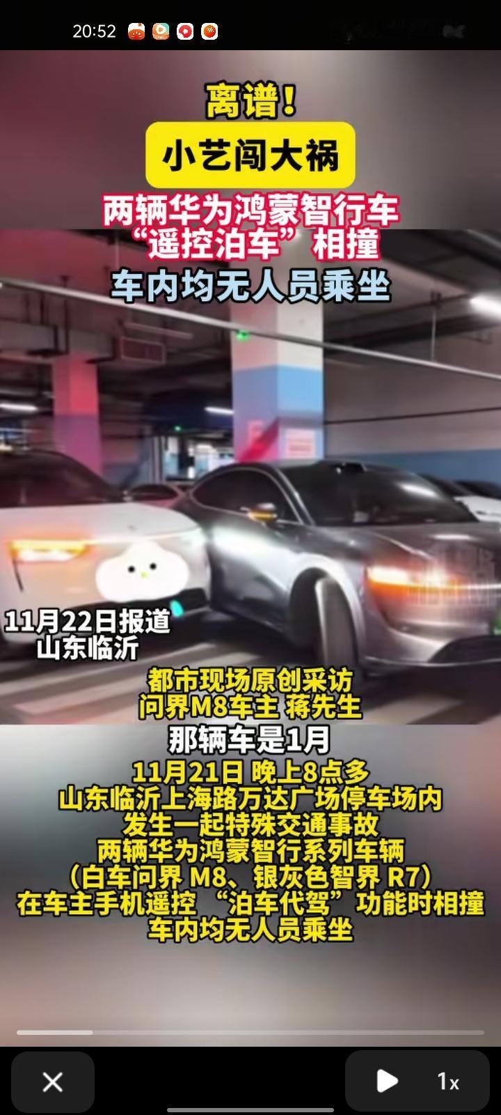 11月21日,山东临沂。停车场内发生一起特殊的交通事故,两辆华为鸿蒙智行系列车辆