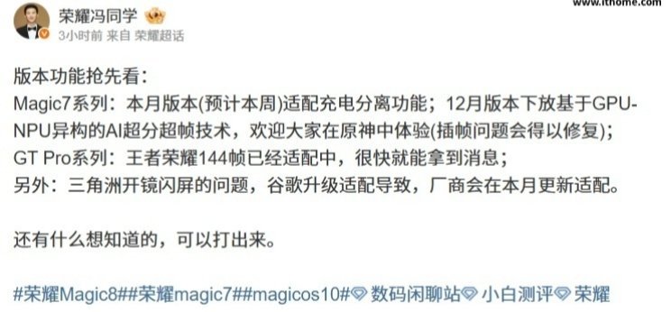 【荣耀游戏研发工程师:《王者荣耀》144Hz 模式已开始填申请,很快就能更新】荣耀游戏研发工程师 荣耀冯同学发文透露,《王者荣耀》144Hz 模式已开始填申请,很快就能更新到用户手里。具体时间不确定,但预估快的话下周慢的话下个月上旬。荣耀游戏研发工程师 荣耀冯同学此前还透露了 MagicOS 未来版本的部分新功能,其中包括荣耀 GT Pro 系列手机正在适配《王者荣耀》144 帧。