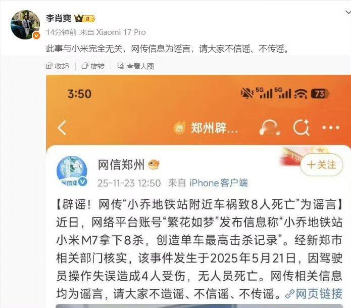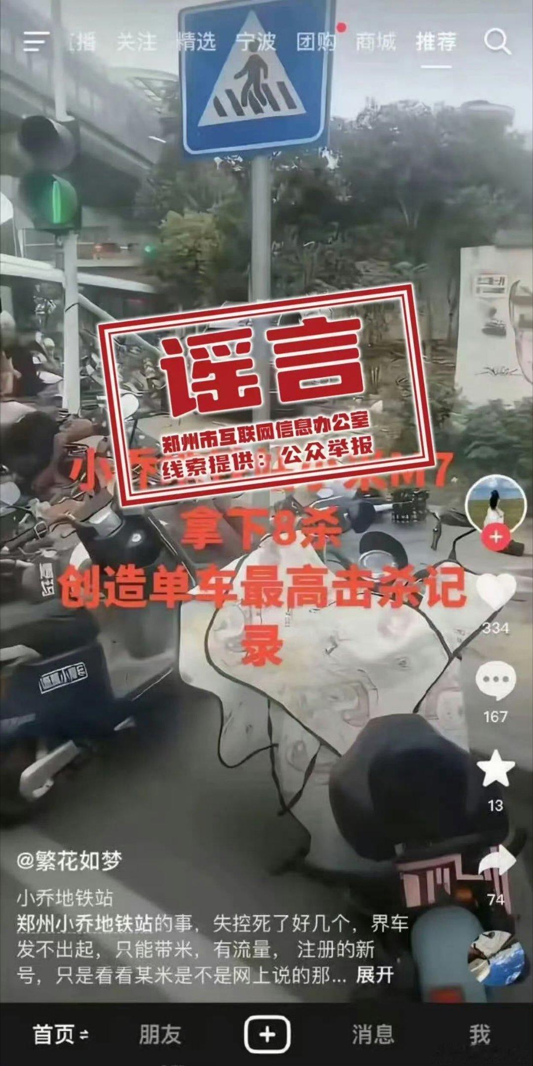 【辟谣!】11月23日,从网信郑州获悉:近日,网络平台账号“繁花如梦”发布信息称“小乔地铁站小米M7拿下8杀,创造单车最高击杀记录”。经新郑市相关部门核实,该事件发生于2025年5月21日,因驾驶员操作失误造成4人受伤,无人员死亡。网传相关信息均为谣言,请大家不造谣、不信谣、不传谣。互联网不是法外之地,在网络上发布信息、发表言论必须遵守法律法规,对于编造、传播、散布谣言等行为,网信、公安等部门将依法依规严厉打击,共同维护清朗网络空间。