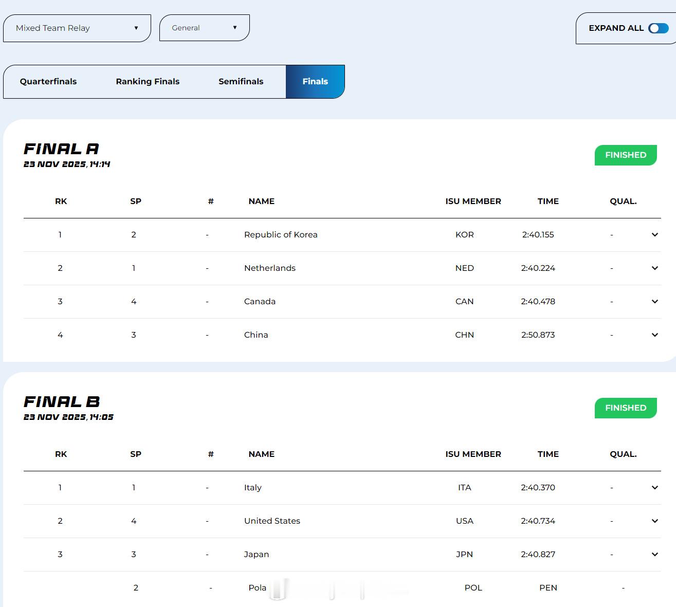 【短道世巡赛混合接力中国摔倒获第四 韩国夺冠】11月23日,短道速滑世界巡回赛波兰格但斯克站最后一日。在男女混合2000米接力比赛中,由公俐、王欣然、刘少昂和林孝埈组成的中国队在比赛中无人碰撞的情况下滑倒,获得第四名。韩国、荷兰和加拿大分获前三名。
