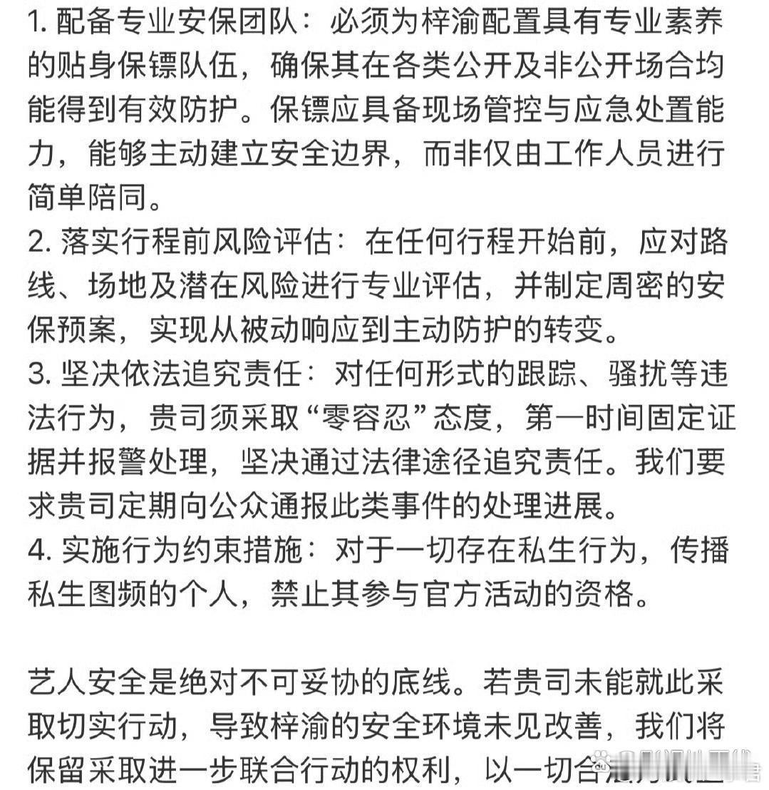 11月23日,梓渝官方粉丝团发文抵制私生,要求经纪公司配备专业安保团队、落实行程前风险评估、坚决依法追究责任、实施行为约束措施。