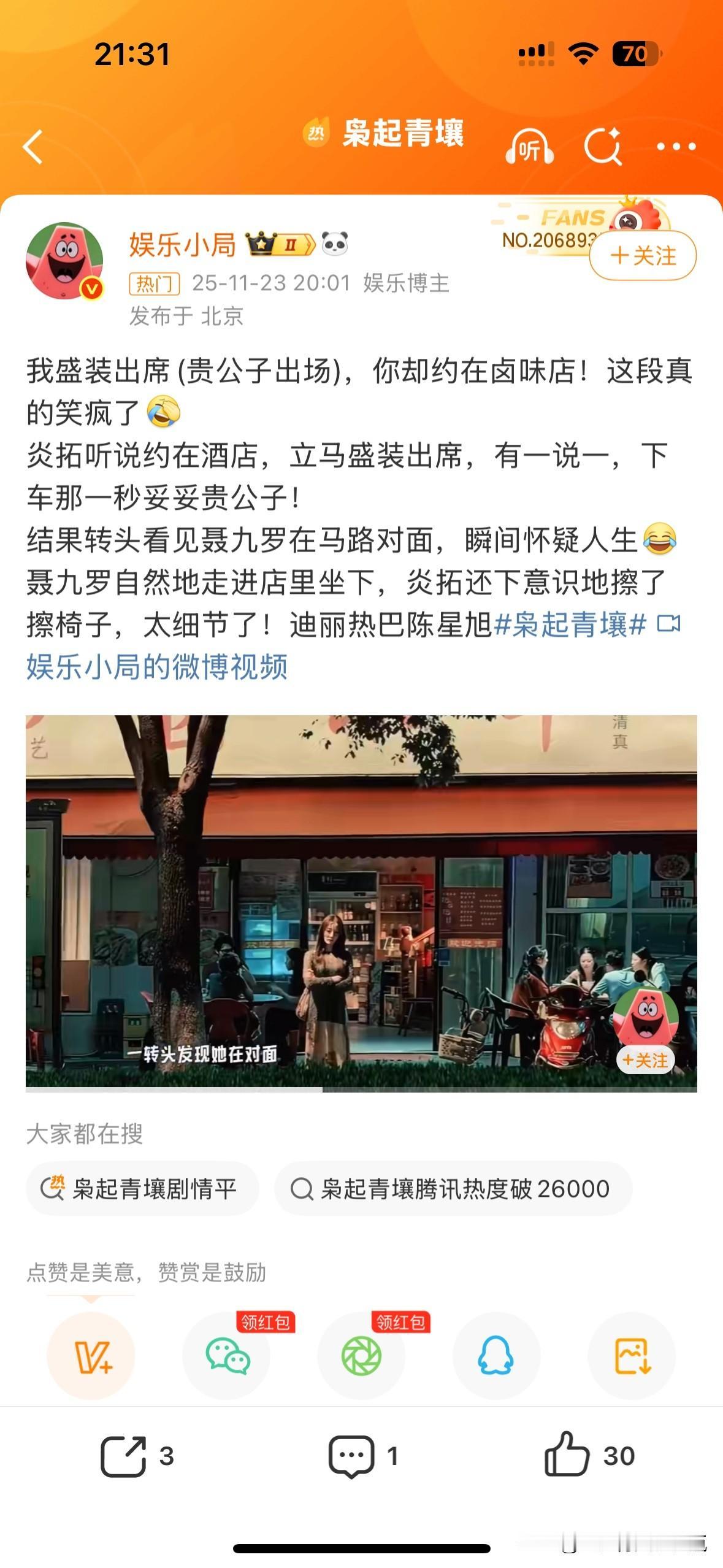 看了六集的《枭起青壤》,综合的评价是故事和节奏还不错,对看多了古装爱情剧的观众来说,这种奇幻玄幻的都市爱情剧倒也是新奇,忽然想起以前看香港tvb的一部剧《我和僵尸有个约会》,感觉这个地枭和南山猎人的设定和那种打僵尸打怪的设定有些类似。 迪丽热巴和陈星旭一语不合就开打,这种情侣设定倒也符合这种需要武力值的剧情,打着打着就彼此掉进去了,说着最狠的话,打着最狠的架,然后谈一场轰轰烈烈的恋爱。 不知道后面会怎样改编,反正看到原著党已经在曲曲编剧了!已经开始不满编剧了!我还没有看原著,准备在头条直接搜索看一下。又怕影响后面的观看。 现在看剧不是那么容易找到喜欢的,《折腰》刚追完,还沉浸在男君女君(得用魏梁的口音和语气来打开这个君字,自带bgm)的先婚后爱甜苦交揉里。 想着还想继续看陈星旭这个帅哥,就先别看原著了,免得也要花精力去曲曲编剧[呲牙]
