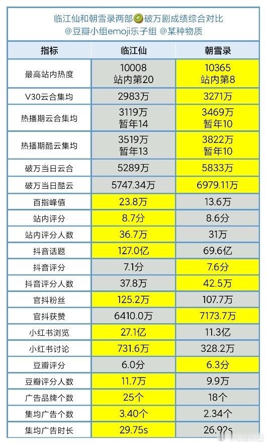 临江仙和朝雪录🥝两部破万剧成绩综合对比