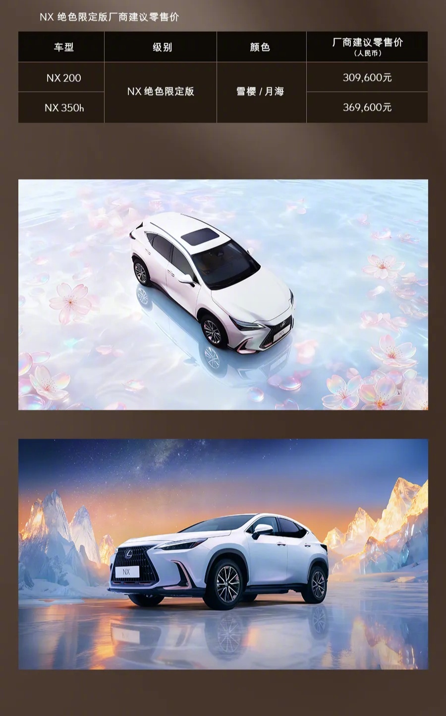 【雷克萨斯 NX 绝色限定版上市:雪樱 / 月海专属配色,30.96-36.96 万元】雷克萨斯在广州车展推出NX绝色限定版,提供“月海”与“雪樱”两款专属配色,售价30.96-36.96万元。新车以极光美甲为灵感,外观炫彩,内饰升级。动力方面提供2.0L和2.5L混动两种选择。