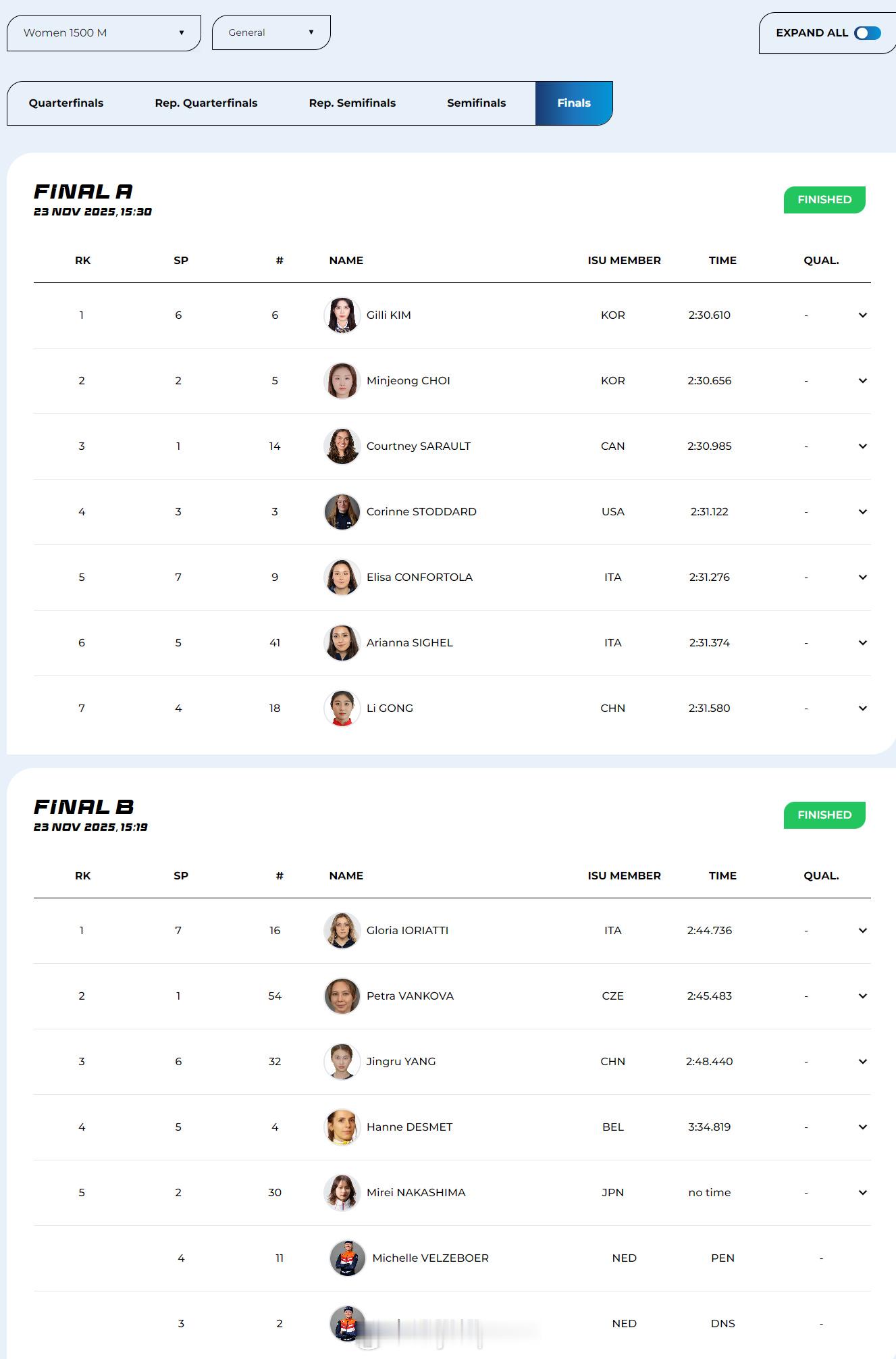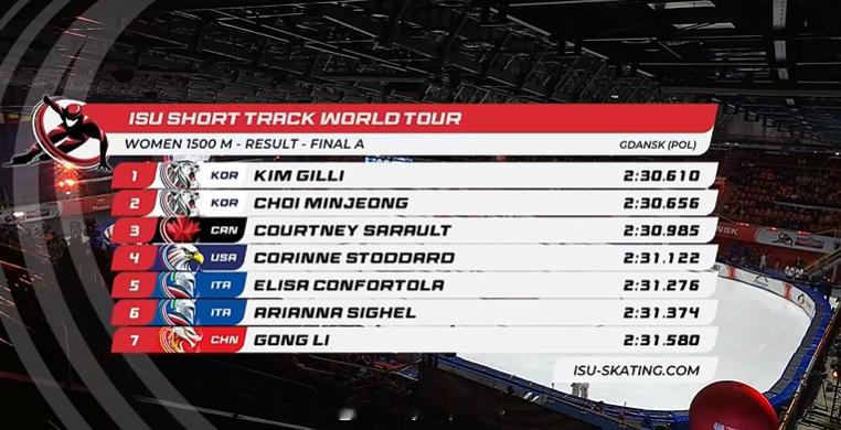 【短道世巡赛女子1500米韩国揽金银牌 公俐第七】11月23日,短道速滑世界巡回赛波兰格但斯克站最后一日。在女子1500米比赛中,韩国金桔里和崔珉祯包揽金银牌,公俐名列第七,杨婧茹获得决赛B组第三。