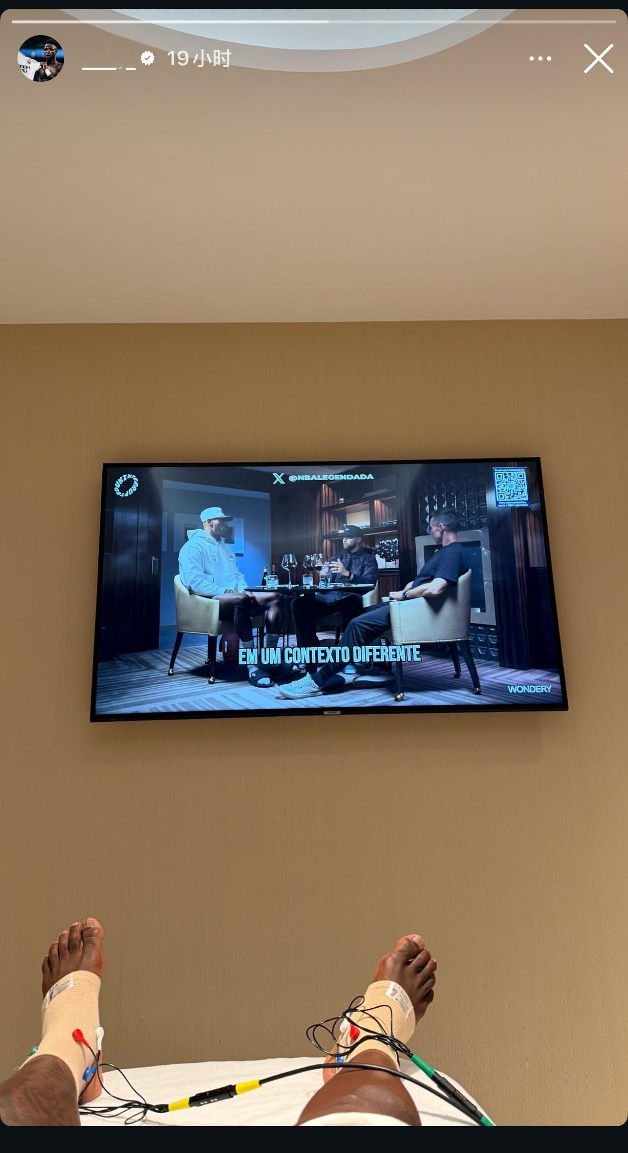 真詹蜜皇马球星维尼修斯一边做治疗一边看詹姆斯的节目《球场大脑》